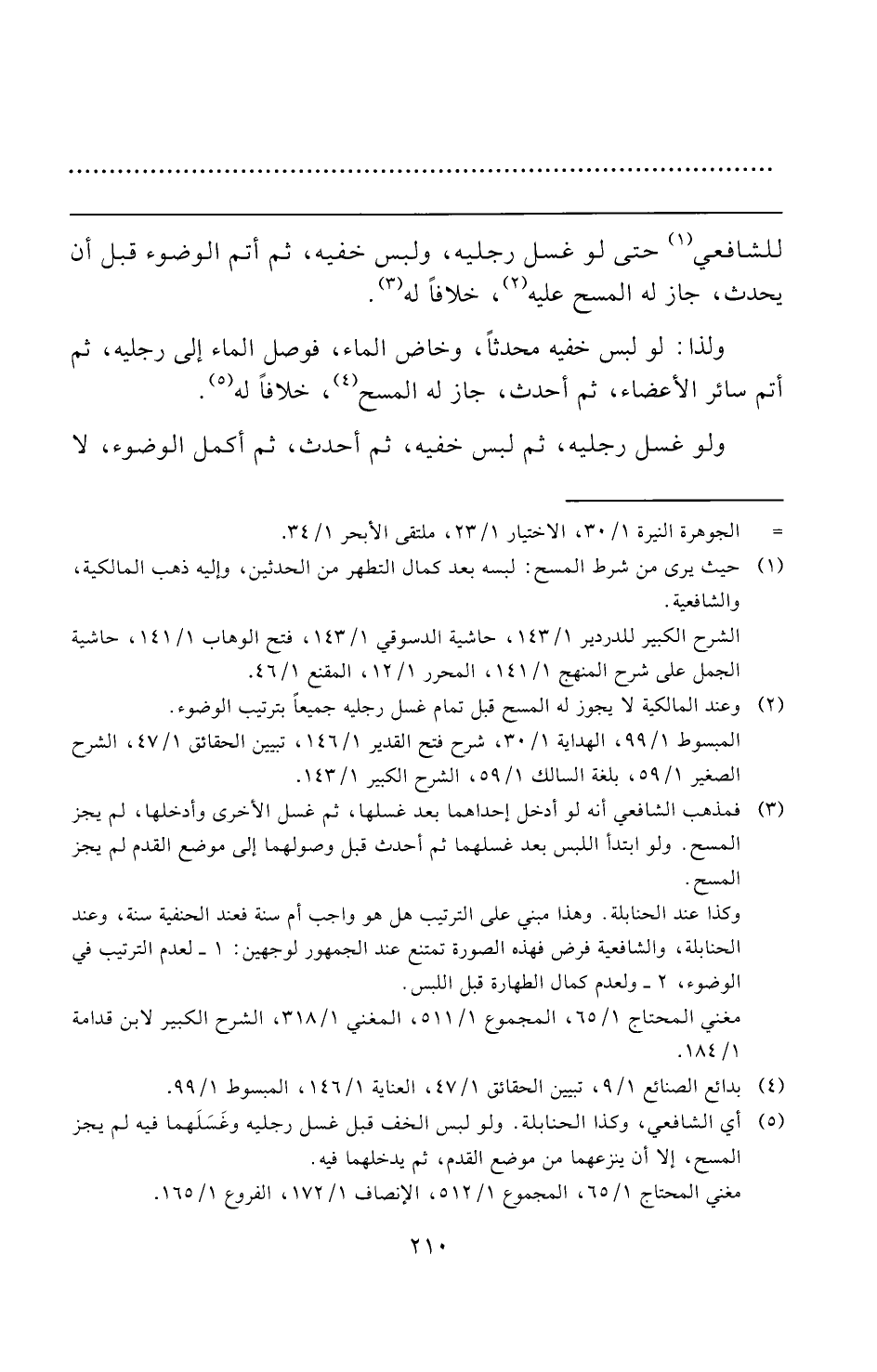 (¬٥) أي الشافعي، وكذا الحنابلة. ولو لبس الخف قبل غسل رجليه وغَسَلَهما فيه لم يجز المسح، إلا أن ينزعهما من موضع القدم، ثم يدخلهما فيه.
