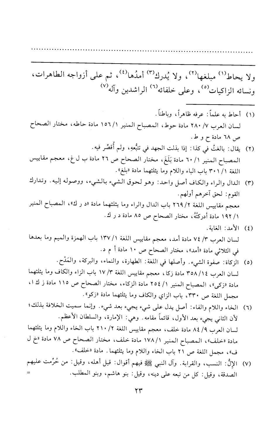 ولا يحاط (¬١) مبلغها (¬٢)، ولا يُدرك (¬٣) أمدُها (¬٤)، ثم على أزواجه الطاهرات، ونسائه الزاكيات (¬٥)، وعلى خلفائه (¬٦) الراشدين وآله (¬٧)