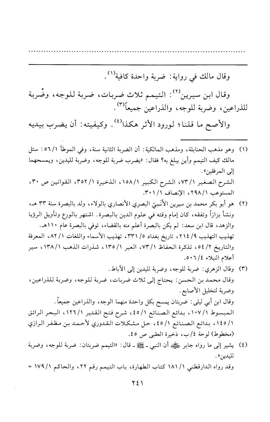 (¬٤) يشير إلى ما رواه جابر -رضي الله عنه- أن النبي -صلي الله عليه وسلم- قال: "التيمم ضربتان: ضربة للوجه، وضربة لليدين".