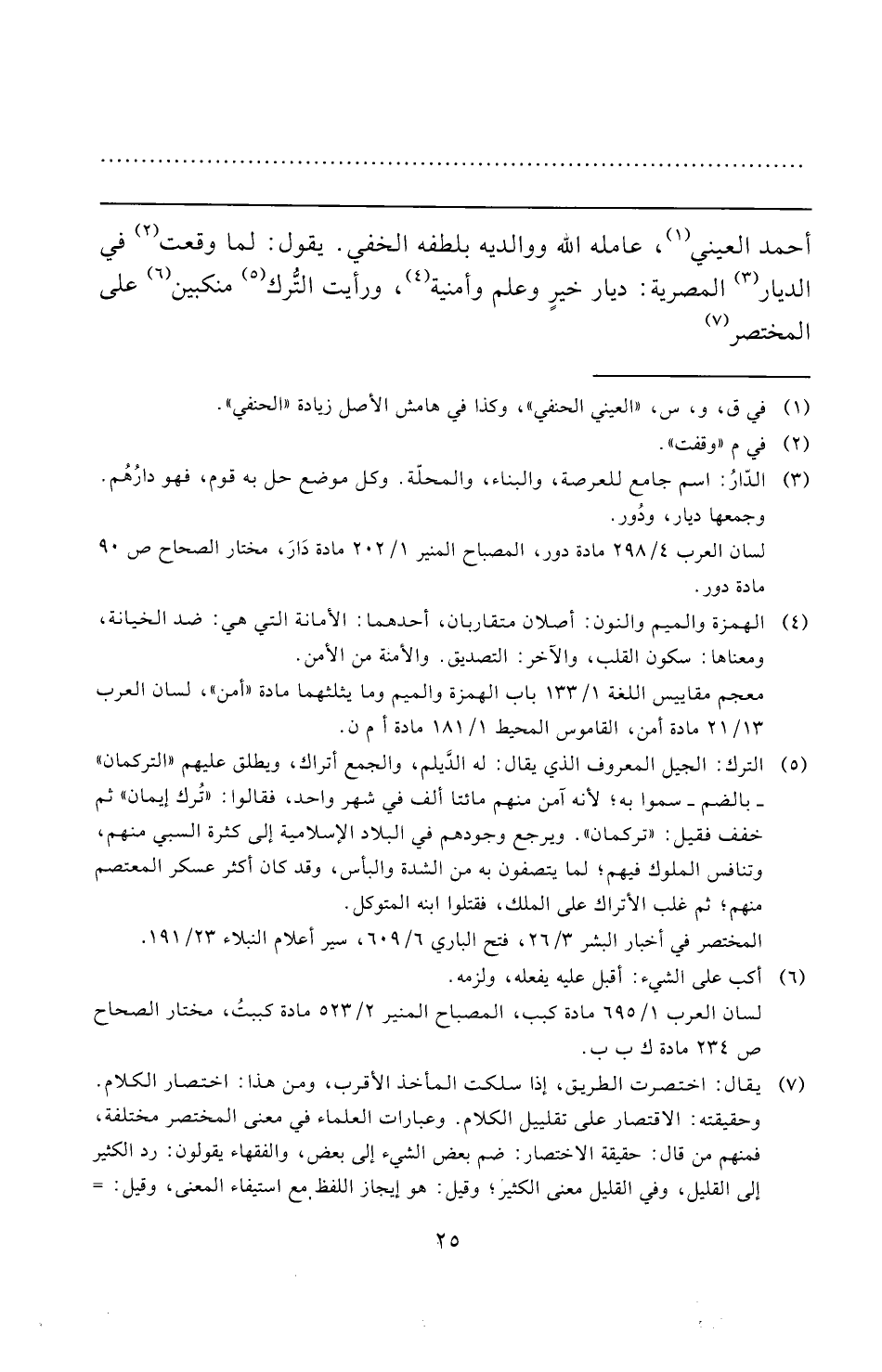 أحمد العيني (¬١)، عامله الله ووالديه بلطفه الخفي. يقول: لما وقعت (¬٢) في الديار (¬٣) المصرية: ديار خيرٍ وعلم وأمنية (¬٤)، ورأيت التُّرك (¬٥) منكبين (¬٦) على المختصر (¬٧)