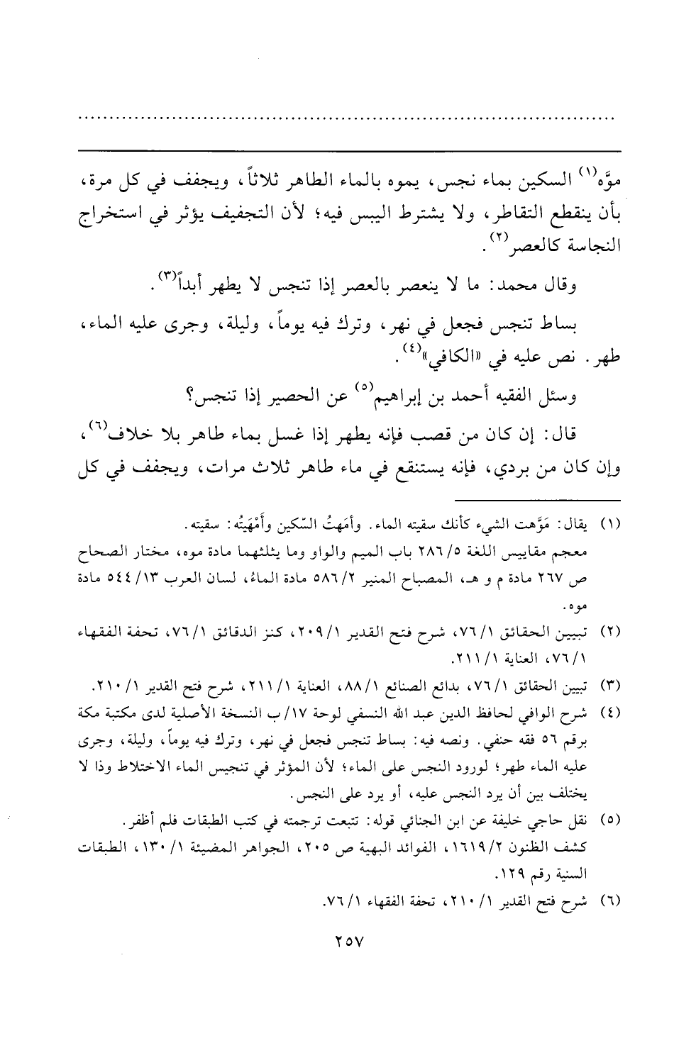 (¬٤) شرح الوافي لحافظ الدين عبد الله النسفي لوحة ١٧/ ب النسخة الأصلية لدى مكتبة مكة برقم ٥٦ فقه حنفي. ونصه فيه: بساط تنجس فجعل في نهر، وترك فيه يومًا، وليلة، وجرى عليه الماء طهر؛ لورود النجس على الماء؛ لأن المؤثر في تنجيس الماء الاختلاط وذا لا يختلف بين أن يرد النجس عليه، أو يرد على النجس.