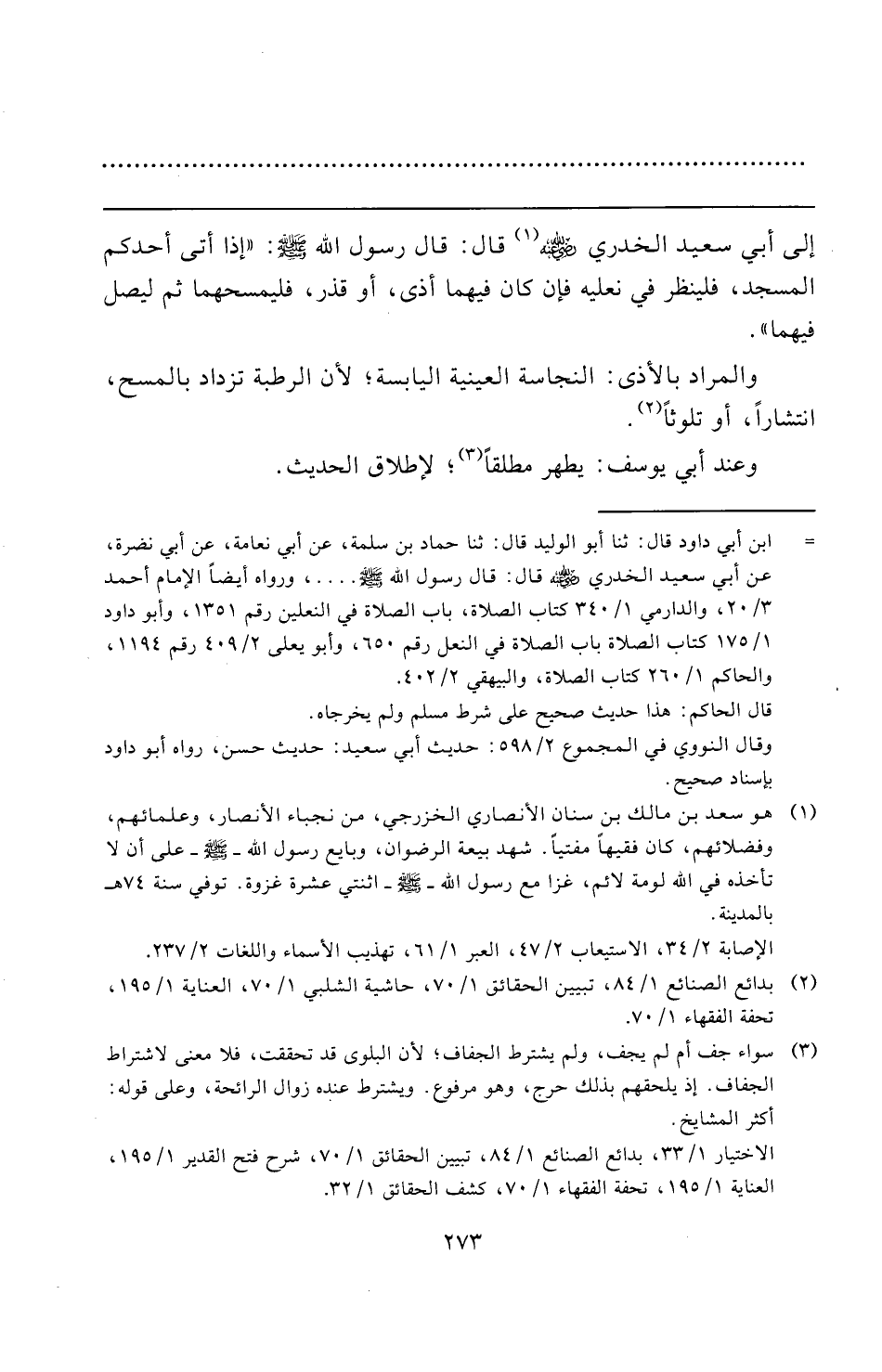 إلى أبي سعيد الخدري -رضي الله عنه- (¬١) قال: قال رسول الله -صلي الله عليه وسلم-: "إذا أتى أحدكم المسجد، فلينظر في نعليه فإن كان فيهما أذى، أو قذر، فليمسحهما ثم ليصل فيهما".