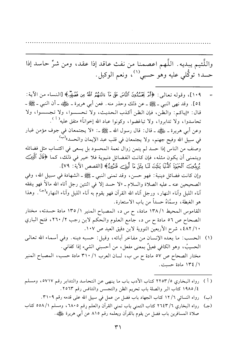 = ١٠٩]، وقوله تعالى: {أَمْ يَحْسُدُونَ النَّاسَ عَلَى مَا آتَاهُمُ اللَّهُ مِنْ فَضْلِهِ} [النساء من الآية: ٥٤]. وقد نهى النبي -صلى الله عليه وسلم- عن ذلك وحذر منه. فعن أبي هريرة -رضي الله عنه- أن النبي -صلى الله عليه وسلم- قال: "إياكم: والظن، فإن الظن أكذب الحديث، ولا تحسسوا، ولا تجسسوا، ولا تحاسدوا، ولا تدابروا، ولا تباغضوا، وكونوا عباد الله إخوانًا" متفق عليه (أ).
