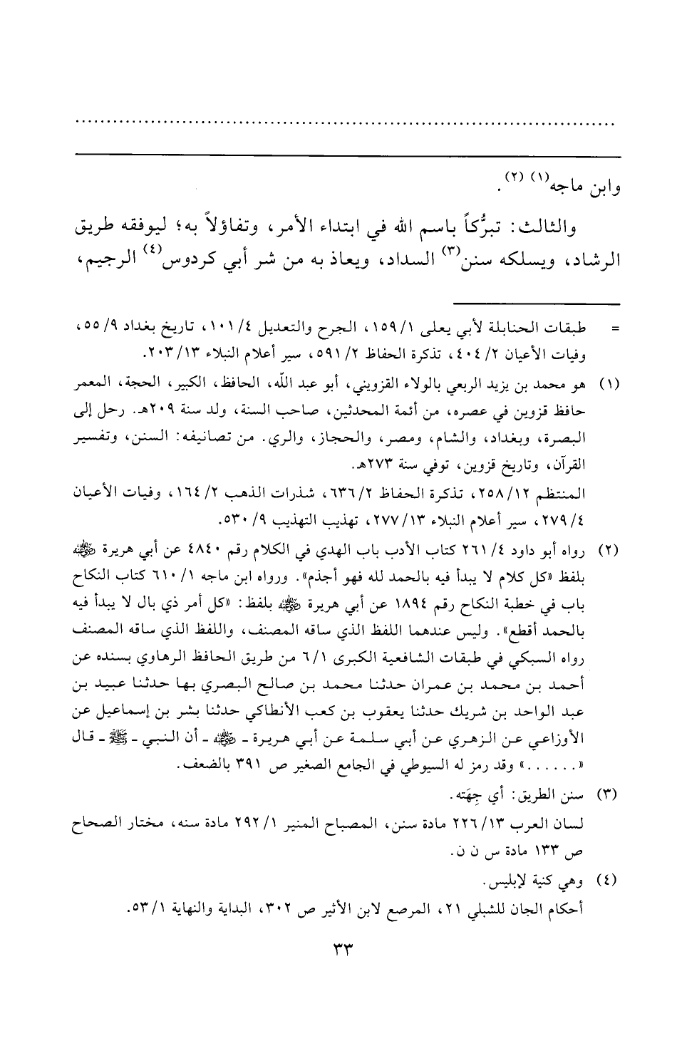 (¬٢) رواه أبو داود ٤/ ٢٦١ كتاب الأدب باب الهدي في الكلام رقم ٤٨٤٠ عن أبي هريرة -رضي الله عنه- بلفظ "كل كلام لا يبدأ فيه بالحمد لله فهو أجذم". ورواه ابن ماجه ١/ ٦١٠ كتاب النكاح باب في خطبة النكاح رقم ١٨٩٤ عن أبي هريرة -رضي الله عنه- بلفظ: "كل أمر ذي بال لا يبدأ فيه بالحمد أقطع". وليس عندهما اللفظ الذي ساقه المصنف، واللفظ الذي ساقه المصنف رواه السبكي في طبقات الشافعية الكبرى ١/ ٦ من طريق الحافظ الرهاوي بسنده عن أحمد بن محمد بن عمران حدثنا محمد بن صالح البصري بها حدثنا عبيد بن عبد الواحد بن شريك حدثنا يعقوب بن كعب الأنطاكي حدثنا بشر بن إسماعيل عن الأوزاعي عن الزهري عن أبي سلمة عن أبي هريرة -رضي الله عنه- أن النبي -صلى الله عليه وسلم- قال " ...... " وقد رمز له السيوطي في الجامع الصغير ص ٣٩١ بالضعف.