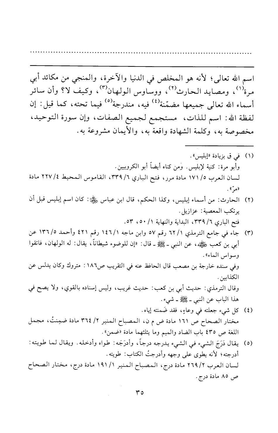 (¬٣) جاء في جامع الترمذي ١/ ٦٢ رقم ٥٧ وابن ماجه ١/ ١٤٦ رقم ٤٢١ وأحمد ٥/ ١٣٦ عن أبي بن كعب -رضي الله عنه-، عن النبي -صلى الله عليه وسلم- قال: "إن للوضوء شيطانًا، يقال: له الولهان، فاتقوا وسواس الماء".