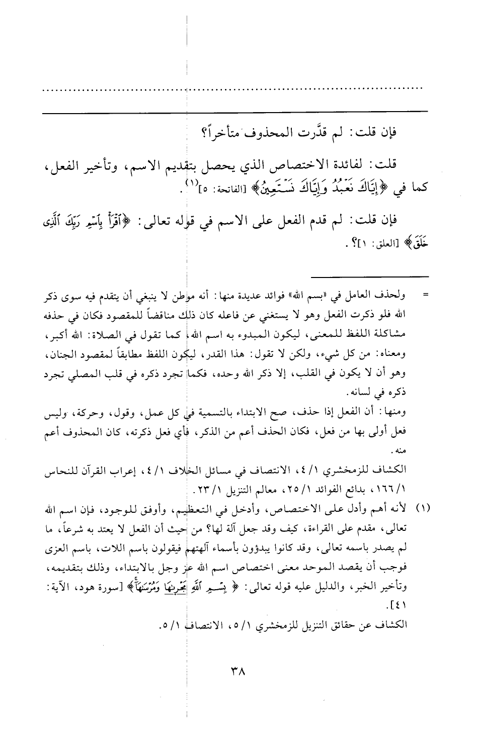 قلت: لفائدة الاختصاص الذي يحصل بتقديم الاسم، وتأخير الفعل، كما في {إِيَّاكَ نَعْبُدُ وَإِيَّاكَ نَسْتَعِينُ} [الفاتحة: ٥] (¬١).