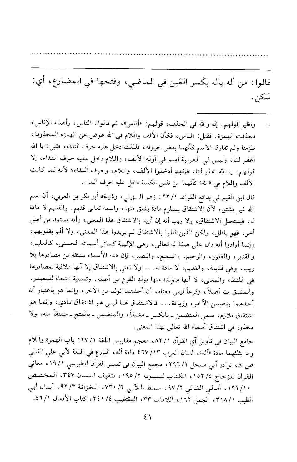 جامع البيان في تأويل آي القرآن ١/ ٨٢، معجم مقاييس اللغة ١/ ١٢٧ باب الهمزة واللام وما يثلثهما مادة "أله"، لسان العرب ١٣/ ٤٦٧ مادة أله، البارع في اللغة لأبي علي القالي ص ٨، نوادر أبي مسحل ١/ ٢٩٦، مجمع البيان في تفسير القرآن للطبرسي ١/ ١٩، معاني القرآن للزجاج ٥/ ١٥٢، الكتاب لسيبويه ٢/ ١٩٥، تثقيف اللسان ٣٤٧، المخصص ١٠/ ١٩١، أمالي القالي ٢/ ٩٧، سمط اللآلي ٢/ ٧٣٠، الخزانة ٣/ ٩٢، أبدال أبي الطيب ١/ ٣١٨، الجمل ١٦٢، اللامات ٣٣، المقتضب ٤/ ٢٤١، كتاب الأفعال ١/ ٤٦.