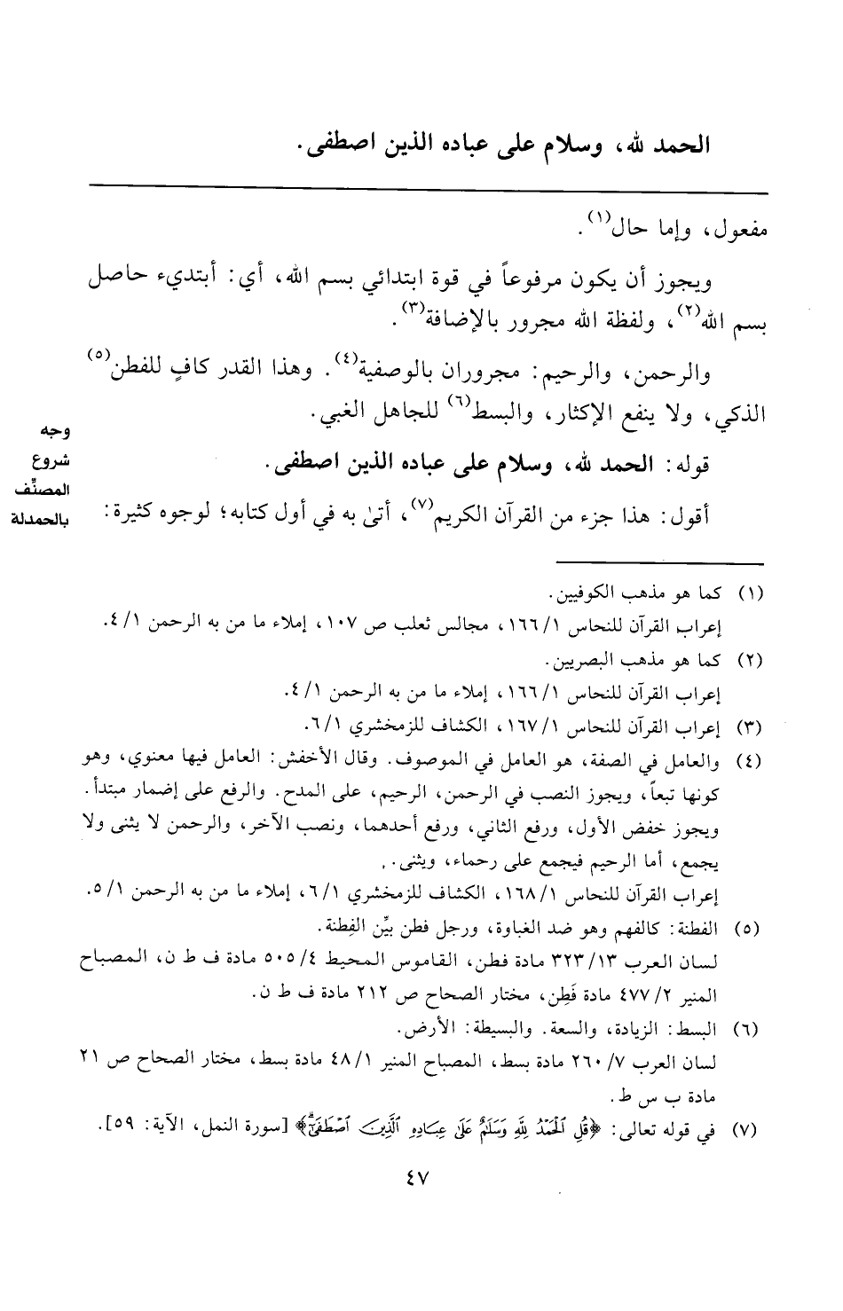 والرحمن، والرحيم: مجروران بالوصفية (¬٤). وهذا القدر كافٍ للفطن (¬٥) الذكي، ولا ينفع الإكثار، والبسط (¬٦) للجاهل الغبي.