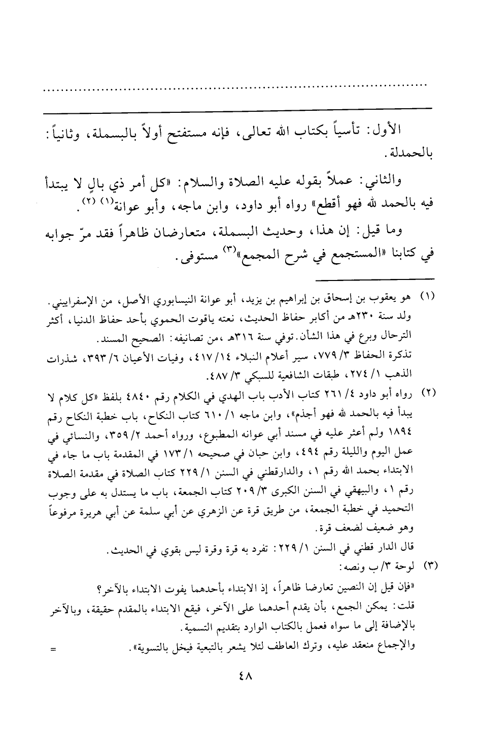 الأول: تأسيًا بكتاب الله تعالى، فإنه مستفتح أولًا بالبسملة، وثانيًا: بالحمدلة.