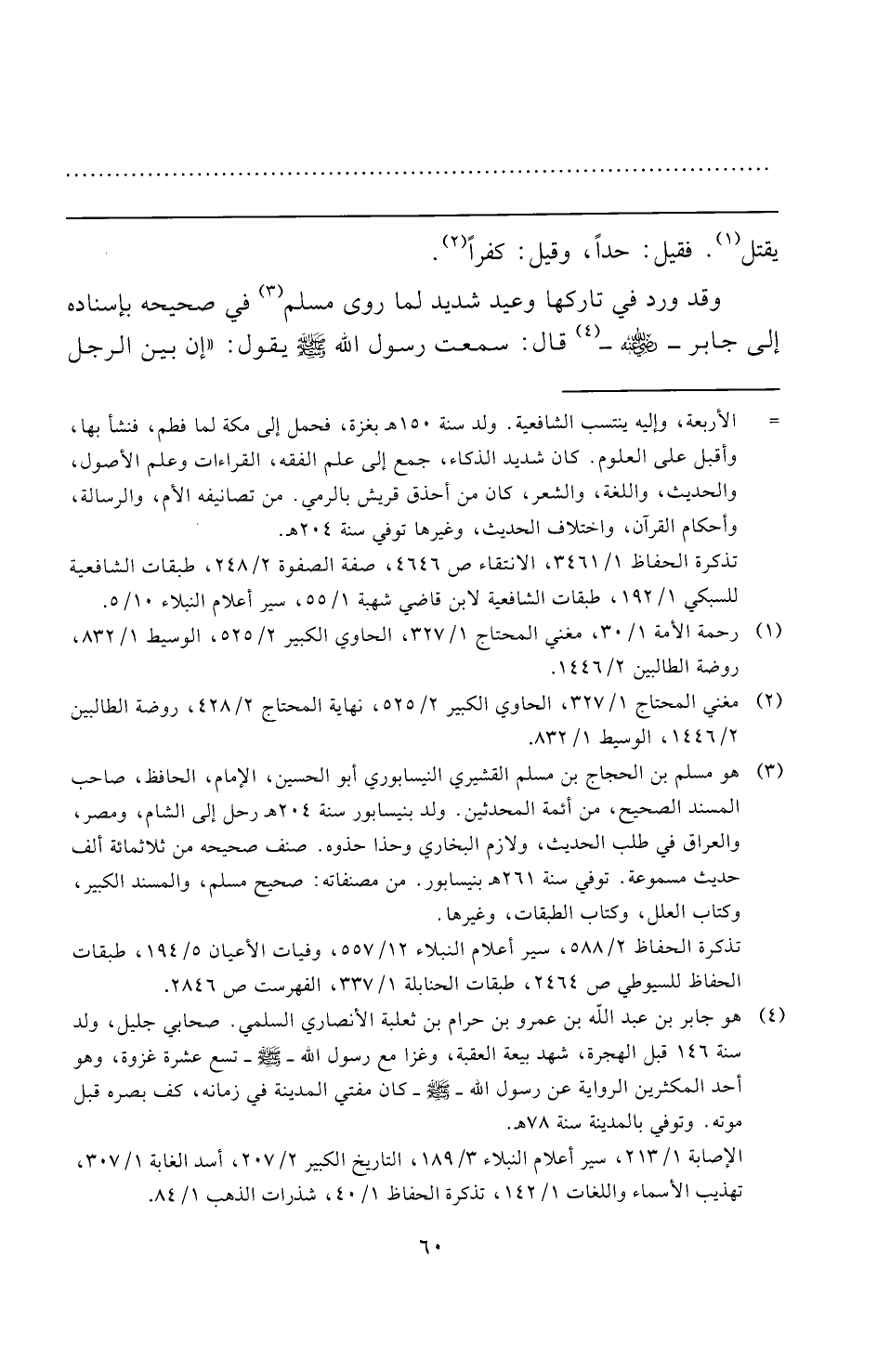 وقد ورد في تاركها وعيد شديد لما روى مسلم (¬٣) في صحيحه بإسناده إلى جابر -رضي الله عنه- (¬٤) قال: سمعت رسول الله -صلى الله عليه وسلم- يقول: "إن بين الرجل