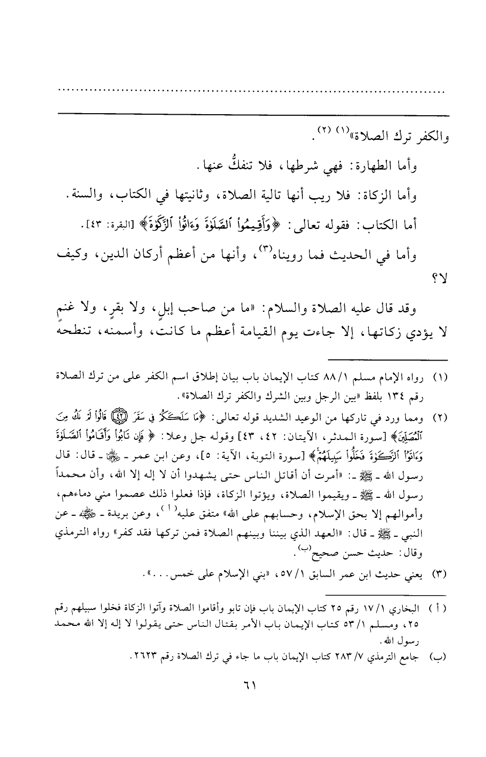 (¬١) رواه الإمام مسلم ١/ ٨٨ كتاب الإيمان باب بيان إطلاق اسم الكفر على من ترك الصلاة رقم ١٣٤ بلفظ "بين الرجل وبين الشرك والكفر ترك الصلاة".