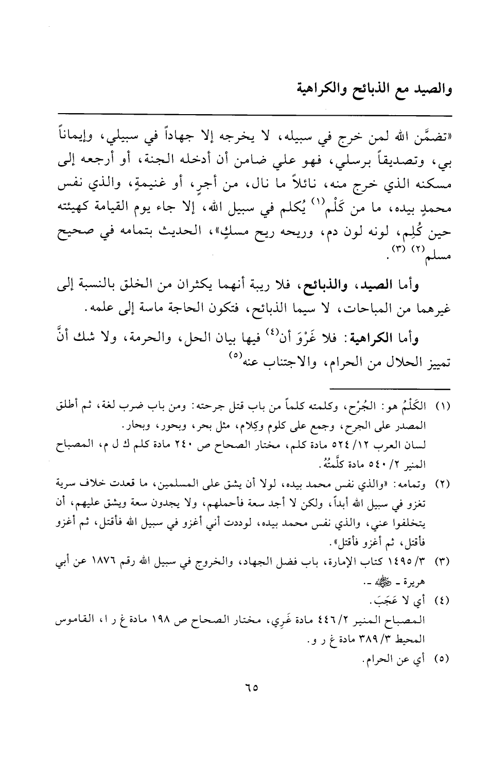 " تضمَّن الله لمن خرج في سبيله، لا يخرجه إلا جهادًا في سبيلي، وإيمانًا بي، وتصديقًا برسلي، فهو علي ضامن أن أدخله الجنة، أو أرجعه إلى مسكنه الذي خرج منه، نائلًا ما نال، من أجرٍ، أو غنيمةٍ، والذي نفس محمدٍ بيده، ما من كَلْم (¬١) يُكلم في سبيل الله، إلا جاء يوم القيامة كهيئته حين كُلِم، لونه لون دم، وريحه ريح مسكٍ"، الحديث بتمامه في صحيح مسلم (¬٢) (¬٣).