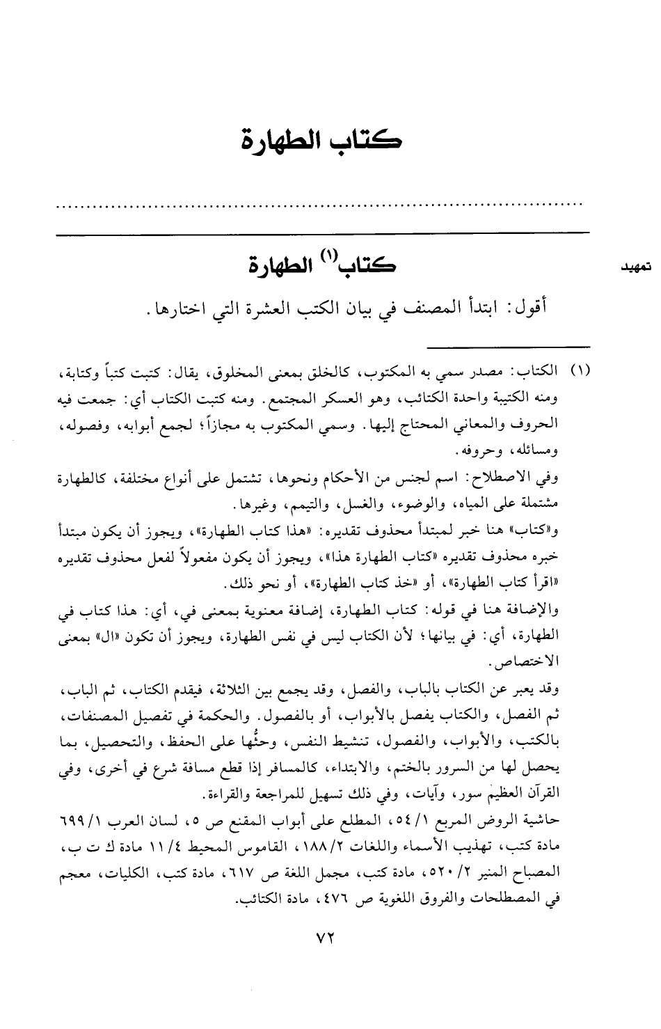 (¬١) الكتاب: مصدر سمي به المكتوب، كالخلق بمعنى المخلوق، يقال: كتبت كتبًا وكتابة، ومنه الكتيبة واحدة الكتائب، وهو العسكر المجتمع. ومنه كتبت الكتاب أي: جمعت فيه الحروف والمعاني المحتاج إليها. وسمي المكتوب به مجازًا؛ لجمع أبوابه، وفصوله، ومسائله، وحروفه.