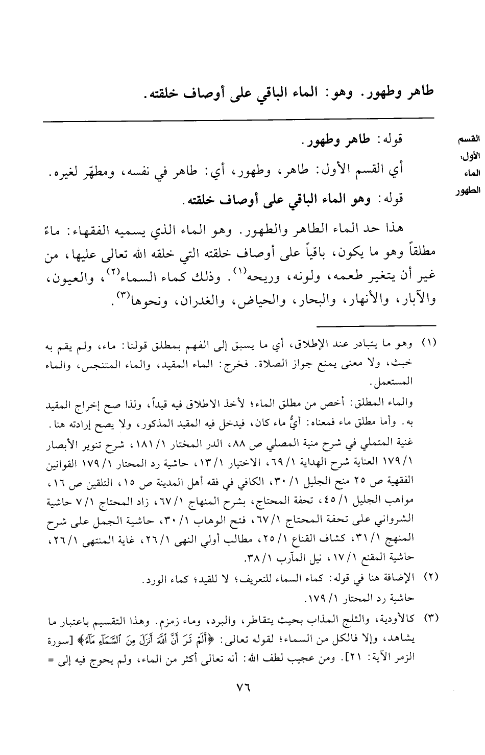 هذا حد الماء الطاهر والطهور. وهو الماء الذي يسميه الفقهاء: ماءً مطلقًا وهو ما يكون، باقيًا على أوصاف خلقته التي خلقه الله تعالى عليها، من غير أن يتغير طعمه، ولونه، وريحه (¬١). وذلك كماء السماء (¬٢)، والعيون، والآبار، والأنهار، والبحار، والحياض، والغدران، ونحوها (¬٣).