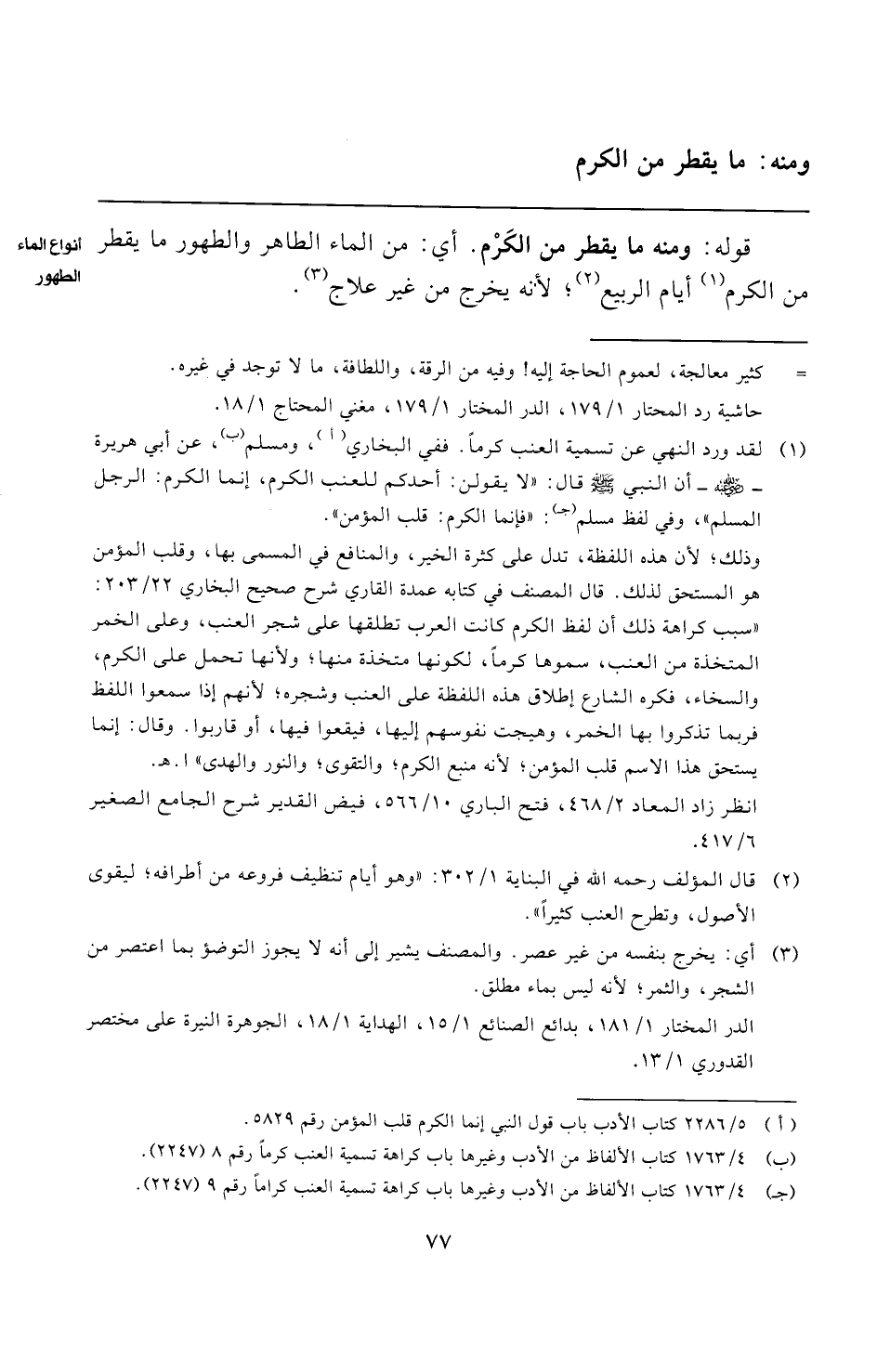 (¬١) لقد ورد النهي عن تسمية العنب كرمًا. ففي البخاري (أ)، ومسلم (ب)، عن أبي هريرة -رضي الله عنه- أن النبي -صلى الله عليه وسلم- قال: "لا يقولن: أحدكم للعنب الكرم، إنما الكرم: الرجل المسلم"، وفي لفظ مسلم (جـ): "فإنما الكرم: قلب المؤمن".