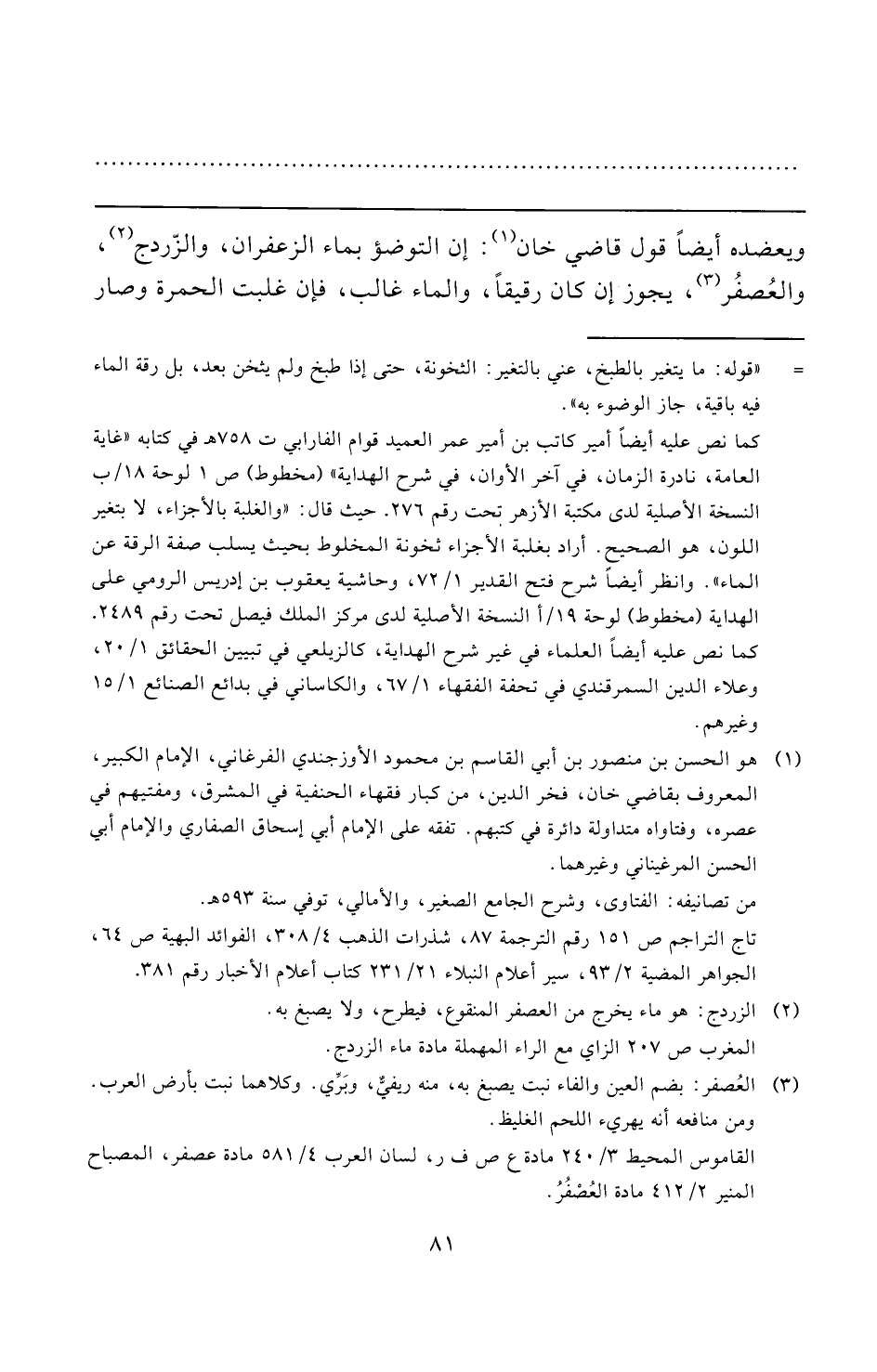 كما نص عليه أيضًا أمير كاتب بن أمير عمر العميد قوام الفارابي ت ٧٥٨ هـ في كتابه "غاية العامة، نادرة الزمان، في آخر الأوان، في شرح الهداية" (مخطوط) ص ١ لوحة ١٨/ ب النسخة الأصلية لدى مكتبة الأزهر تحت رقم ٢٧٦. حيث قال: "والغلبة بالأجزاء، لا بتغير اللون، هو الصحيح. أراد بغلبة الأجزاء ثخونة المخلوط بحيث يسلب صفة الرقة عن الماء". وانظر أيضًا شرح فتح القدير ١/ ٧٢، وحاشية يعقوب بن إدريس الرومي على الهداية (مخطوط) لوحة ١٩/ أالنسخة الأصلية لدى مركز الملك فيصل تحت رقم ٢٤٨٩.
