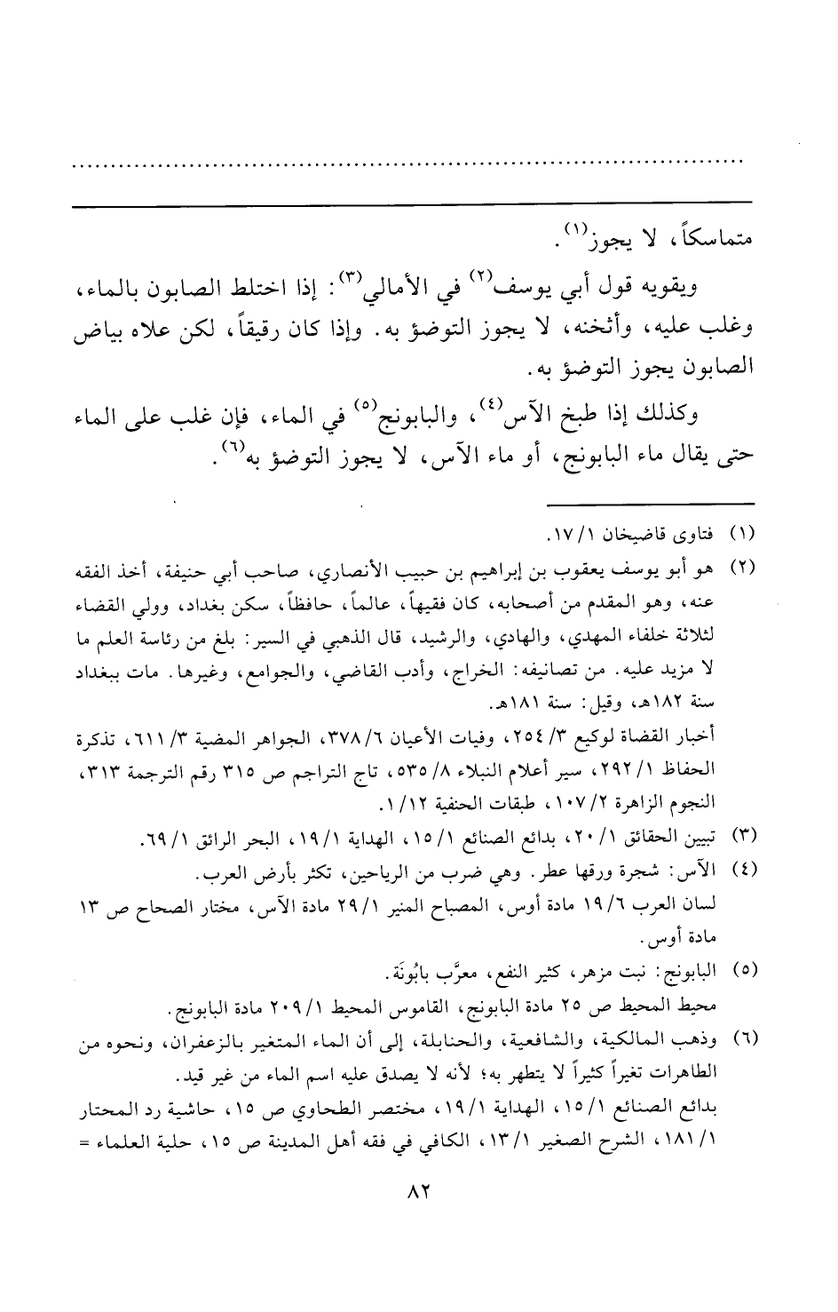 (¬٢) هو أبو يوسف يعقوب بن إبراهيم بن حبيب الأنصاري، صاحب أبي حنيفة، أخذ الفقه عنه، وهو المقدم من أصحابه، كان فقيهًا، عالمًا، حافظًا، سكن بغداد، وولي القضاء لثلاثة خلفاء المهدي، والهادي، والرشيد، قال الذهبي في السير: بلغ من رئاسة العلم ما لا مزيد عليه. من تصانيفه: الخراج، وأدب القاضي، والجوامع، وغيرها. مات ببغداد سنة ١٨٢ هـ، وقيل: سنة ١٨١ هـ.
