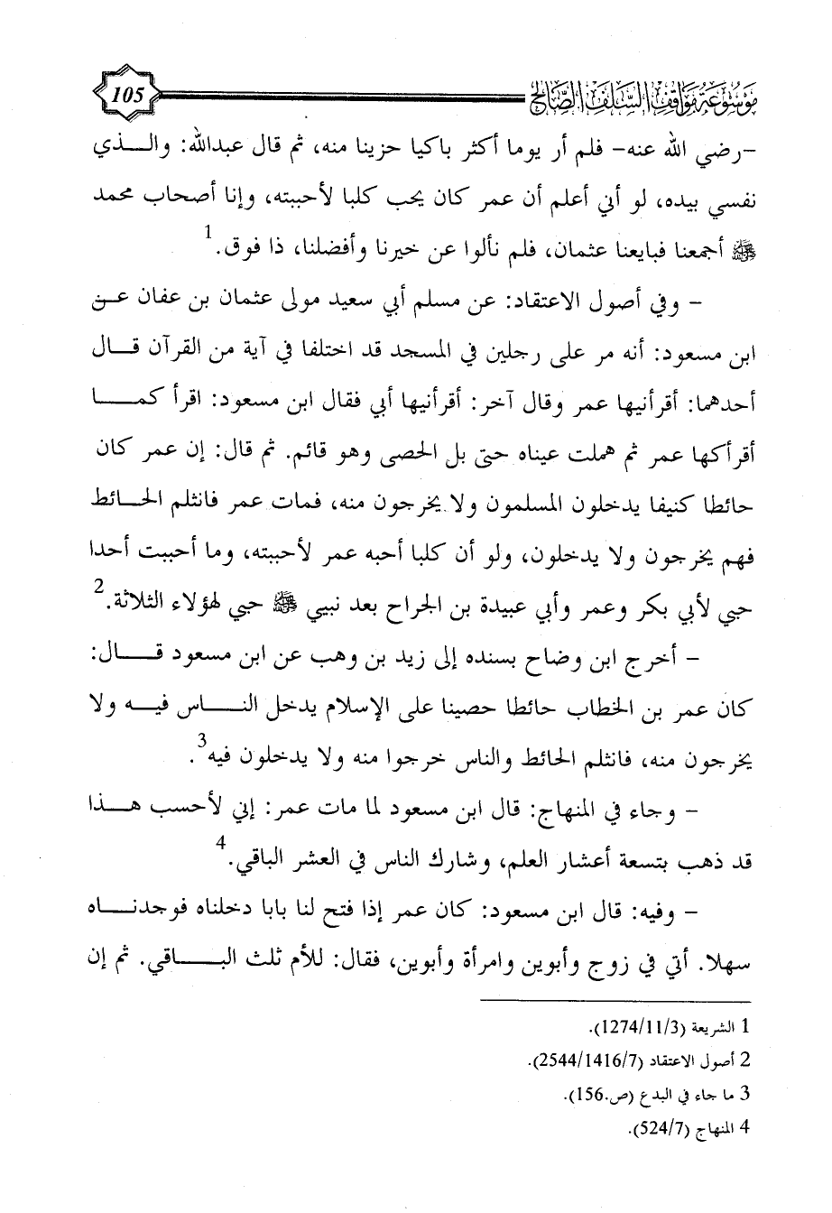 - وفي أصول الاعتقاد: عن مسلم أبي سعيد مولى عثمان بن عفان عن ابن مسعود: أنه مر على رجلين في المسجد قد اختلفا في آية من القرآن قال أحدهما: أقرأنيها عمر وقال آخر: أقرأنيها أبي فقال ابن مسعود: اقرأ كما أقرأكها عمر ثم هملت عيناه حتى بل الحصى وهو قائم. ثم قال: إن عمر كان حائطا كنيفا يدخلون المسلمون ولا يخرجون منه، فمات عمر فانثلم الحائط فهم يخرجون ولا يدخلون، ولو أن كلبا أحبه عمر لأحببته، وما أحببت أحدا حبي لأبي بكر وعمر وأبي عبيدة بن الجراح بعد نبيي - صلى الله عليه وسلم - حبي لهؤلاء الثلاثة. (¬2)