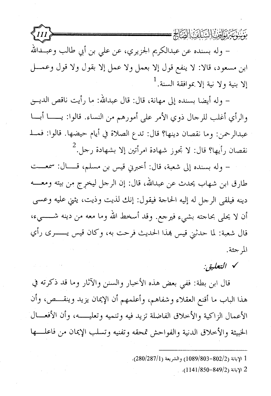 قال ابن بطة: ففي بعض هذه الأخبار والسنن والآثار وما قد ذكرته في هذا الباب ما أقنع العقلاء وشفاهم، وأعلمهم أن الإيمان يزيد وينقص، وأن الأعمال الزاكية والأخلاق الفاضلة تزيد فيه وتنميه وتعليه، وأن الأفعال الخبيثة والأخلاق الدنية والفواحش تمحقه وتفنيه وتسلب الإيمان من فاعلها