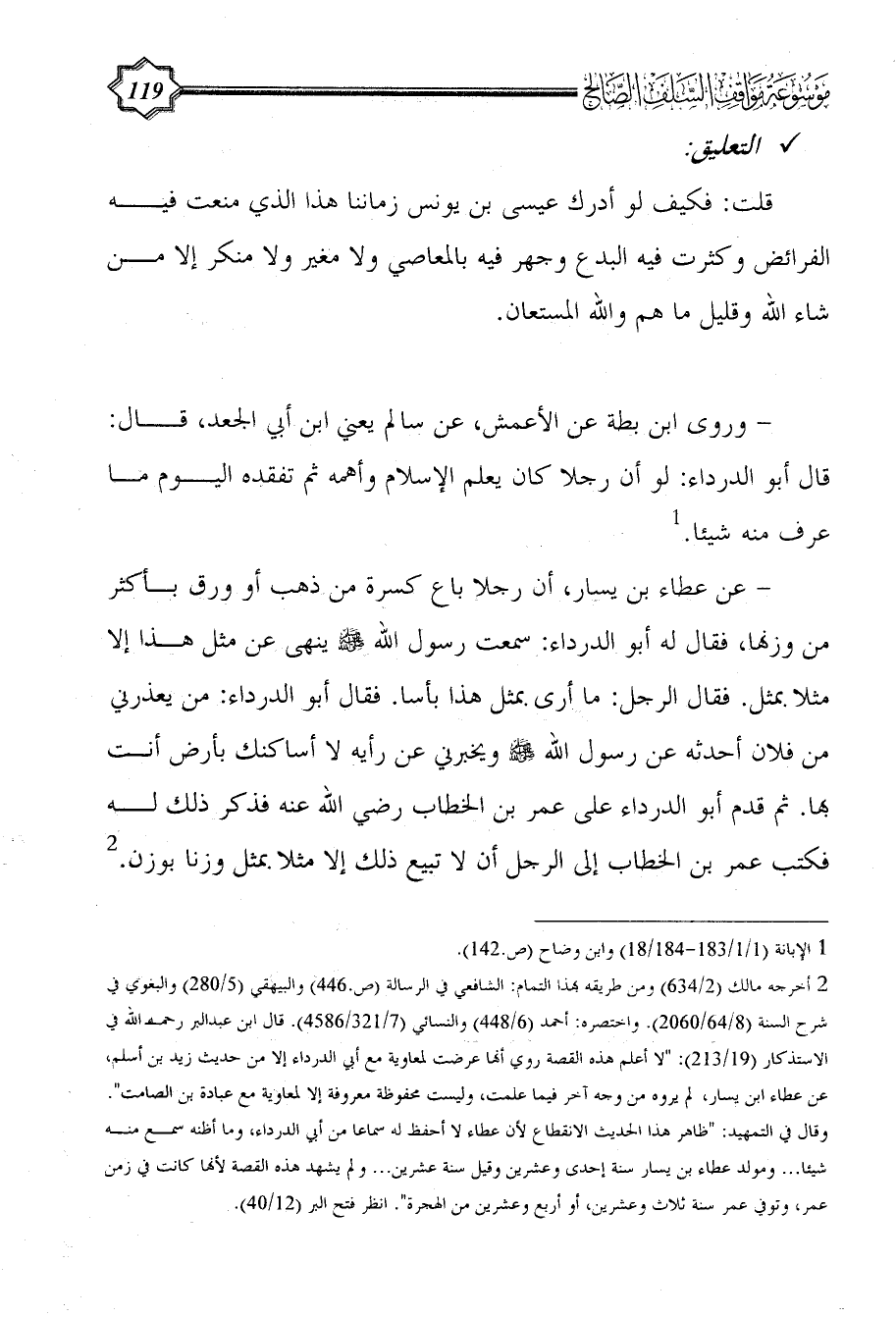 (¬2) أخرجه مالك (2/ 634) ومن طريقه بهذا التمام: الشافعي في الرسالة (ص.446) والبيهقي (5/ 280) والبغوي في شرح السنة (8/ 64/2060). واختصره: أحمد (6/ 448) والنسائي (7/ 321/4586). قال ابن عبد البر رحمه الله في الاستذكار (19/ 213): "لا أعلم هذه القصة روي أنها عرضت لمعاوية مع أبي الدرداء إلا من حديث زيد بن أسلم، عن عطاء ابن يسار، لم يروه من وجه آخر فيما علمت، وليست محفوظة معروفة إلا لمعاوية مع عبادة بن الصامت". وقال في التمهيد: "ظاهر هذا الحديث الانقطاع لأن عطاء لا أحفظ له سماعا من أبي الدرداء، وما أظنه سمع منه شيئا ... ومولد عطاء بن يسار سنة إحدى وعشرين وقيل سنة عشرين ... ولم يشهد هذه القصة لأنها كانت في زمن عمر، وتوفي عمر سنة ثلاث وعشرين، أو أربع وعشرين من الهجرة". انظر فتح البر (12/ 40).