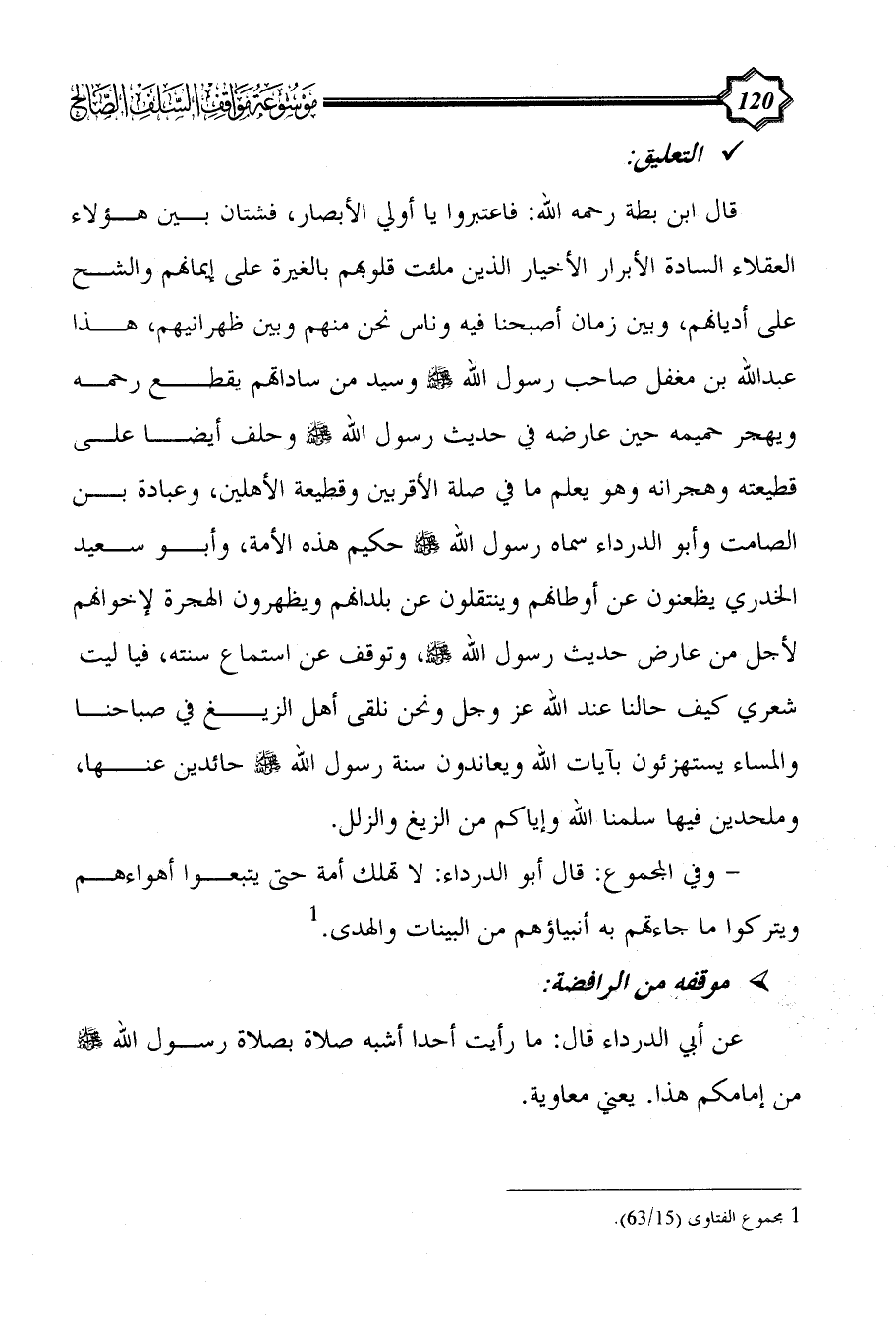 قال ابن بطة رحمه الله: فاعتبروا يا أولي الأبصار، فشتان بين هؤلاء العقلاء السادة الأبرار الأخيار الذين ملئت قلوبهم بالغيرة على إيمانهم والشح على أديانهم، وبين زمان أصبحنا فيه وناس نحن منهم وبين ظهرانيهم، هذا عبد الله بن مغفل صاحب رسول الله - صلى الله عليه وسلم - وسيد من ساداتهم يقطع رحمه ويهجر حميمه حين عارضه في حديث رسول الله - صلى الله عليه وسلم - وحلف أيضا على قطيعته وهجرانه وهو يعلم ما في صلة الأقربين وقطيعة الأهلين، وعبادة بن الصامت وأبو الدرداء سماه رسول الله - صلى الله عليه وسلم - حكيم هذه الأمة، وأبو سعيد الخدري يظعنون عن أوطانهم وينتقلون عن بلدانهم ويظهرون الهجرة لإخوانهم لأجل من عارض حديث رسول الله - صلى الله عليه وسلم -، وتوقف عن استماع سنته، فيا ليت شعري كيف حالنا عند الله عز وجل ونحن نلقى أهل الزيغ في صباحنا والمساء يستهزئون بآيات الله ويعاندون سنة رسول الله - صلى الله عليه وسلم - حائدين عنها، وملحدين فيها سلمنا الله وإياكم من الزيغ والزلل.