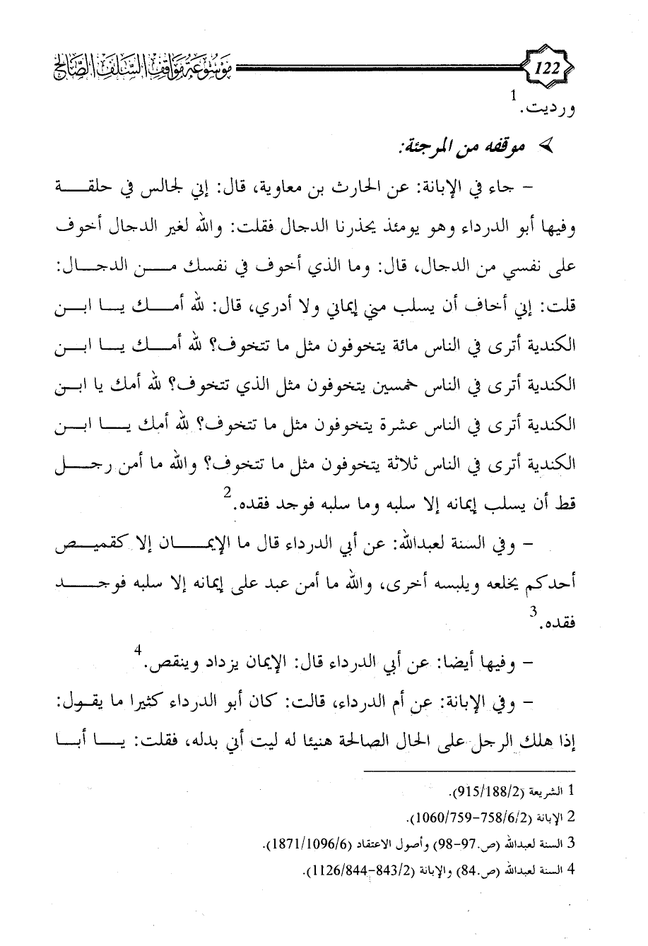 - جاء في الإبانة: عن الحارث بن معاوية، قال: إني لجالس في حلقة وفيها أبو الدرداء وهو يومئذ يحذرنا الدجال فقلت: والله لغير الدجال أخوف على نفسي من الدجال، قال: وما الذي أخوف في نفسك من الدجال: قلت: إني أخاف أن يسلب مني إيماني ولا أدري، قال: لله أمك يا ابن الكندية أترى في الناس مائة يتخوفون مثل ما تتخوف؟ لله أمك يا ابن الكندية أترى في الناس خمسين يتخوفون مثل الذي تتخوف؟ لله أمك يا ابن الكندية أترى في الناس عشرة يتخوفون مثل ما تتخوف؟ لله أمك يا ابن الكندية أترى في الناس ثلاثة يتخوفون مثل ما تتخوف؟ والله ما أمن رجل قط أن يسلب إيمانه إلا سلبه وما سلبه فوجد فقده. (¬2)