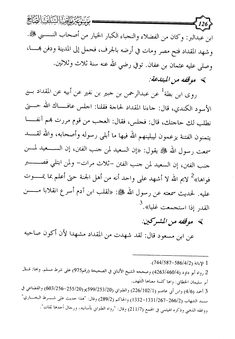 روى ابن بطة (¬1) عن عبد الرحمن بن جبير بن نفير عن أبيه عن المقداد بن الأسود الكندي، قال: جاءنا المقداد لحاجة فقلنا: اجلس عافاك الله حتى نطلب لك حاجتك، قال: فجلس، فقال: العجب من قوم مررت بهم آنفا يتمنون الفتنة يزعمون ليبلينهم الله فيها ما أبلى رسوله وأصحابه، والله لقد سمعت رسول الله - صلى الله عليه وسلم - يقول: "إن السعيد لمن جنب الفتن، إن السعيد لمن جنب الفتن، إن السعيد لمن جنب الفتن -ثلاث مرات- ولمن ابتلي فصبر فواها" (¬2) لايم الله لا أشهد على واحد أنه من أهل الجنة حتى أعلم بما يموت عليه. لحديث سمعته عن رسول الله - صلى الله عليه وسلم -: "لقلب ابن آدم أسرع انقلابا من القدر إذا استجمعت غليا". (¬3)