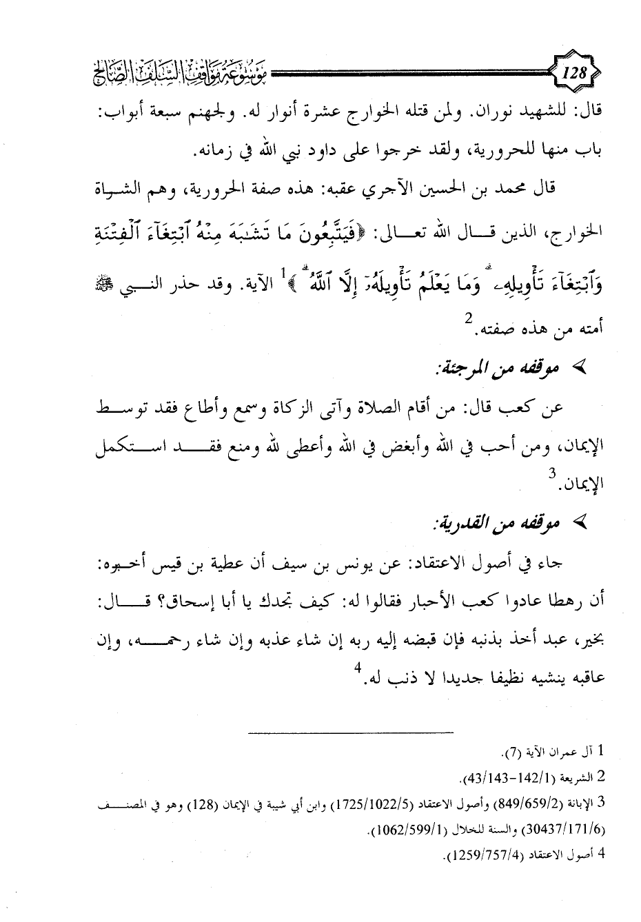 قال محمد بن الحسين الآجري عقبه: هذه صفة الحرورية، وهم الشراة الخوارج، الذين قال الله تعالى: {فَيَتَّبِعُونَ مَا تَشَابَهَ مِنْهُ ابْتِغَاءَ الْفِتْنَةِ وَابْتِغَاءَ تَأْوِيلِهِ وَمَا يَعْلَمُ تَأْوِيلَهُ إِلَّا اللَّهُ} (¬1) الآية. وقد حذر النبي - صلى الله عليه وسلم - أمته من هذه صفته. (¬2)