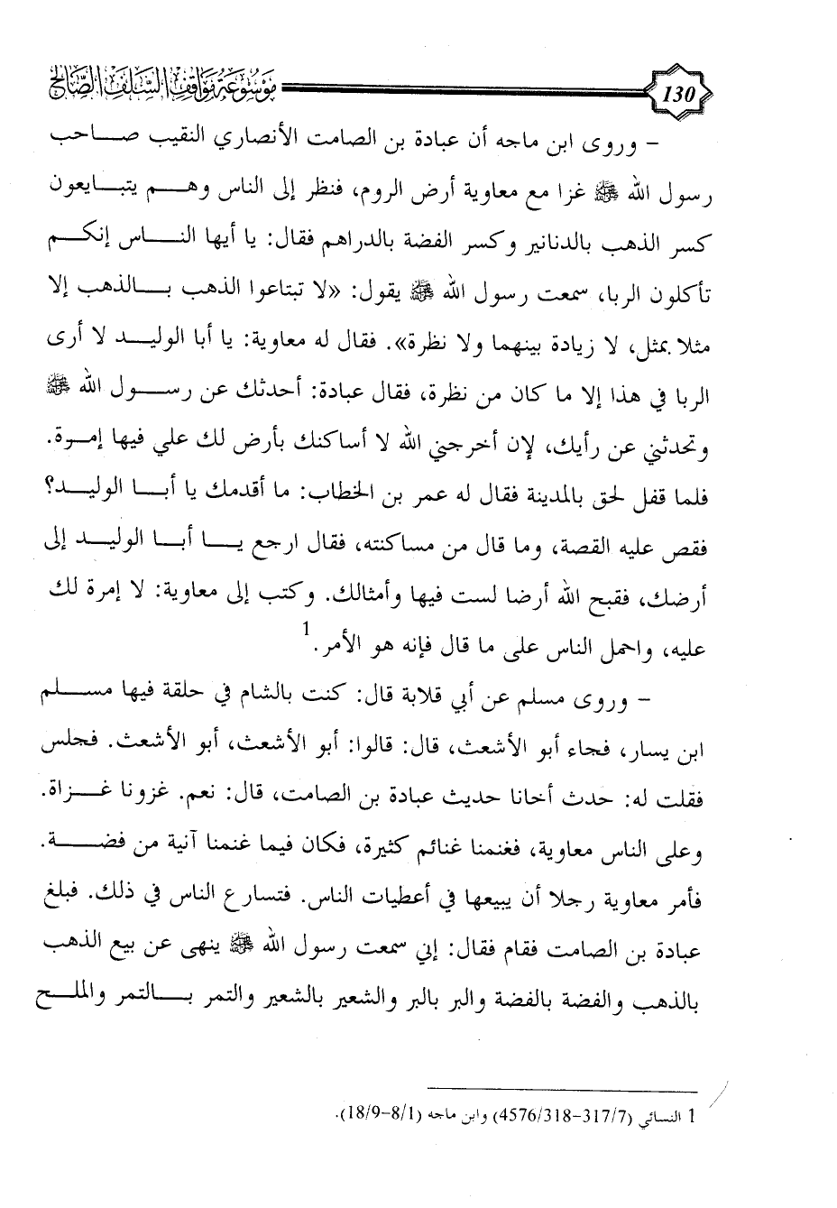 - وروى ابن ماجه أن عبادة بن الصامت الأنصاري النقيب صاحب رسول الله - صلى الله عليه وسلم - غزا مع معاوية أرض الروم، فنظر إلى الناس وهم يتبايعون كسر الذهب بالدنانير وكسر الفضة بالدراهم فقال: يا أيها الناس إنكم تأكلون الربا، سمعت رسول الله - صلى الله عليه وسلم - يقول: "لا تبتاعوا الذهب بالذهب إلا مثلا بمثل، لا زيادة بينهما ولا نظرة". فقال له معاوية: يا أبا الوليد لا أرى الربا في هذا إلا ما كان من نظرة، فقال عبادة: أحدثك عن رسول الله - صلى الله عليه وسلم - وتحدثني عن رأيك، لإن أخرجني الله لا أساكنك بأرض لك علي فيها إمرة. فلما قفل لحق بالمدينة فقال له عمر بن الخطاب: ما أقدمك يا أبا الوليد؟ فقص عليه القصة، وما قال من مساكنته، فقال ارجع يا أبا الوليد إلى أرضك، فقبح الله أرضا لست فيها وأمثالك. وكتب إلى معاوية: لا إمرة لك عليه، واحمل الناس على ما قال فإنه هو الأمر. (¬1)