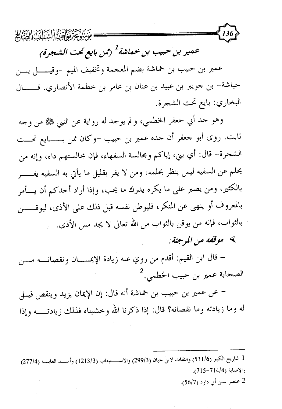 - قال ابن القيم: أقدم من روي عنه زيادة الإيمان ونقصانه من الصحابة عمير بن حبيب الخطمي. (¬2)