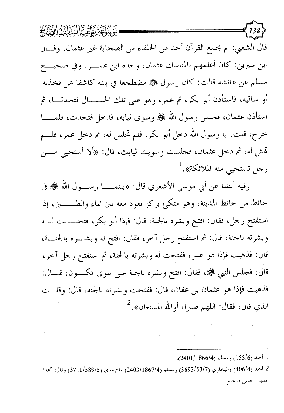 قال الشعبي: لم يجمع القرآن أحد من الخلفاء من الصحابة غير عثمان. وقال ابن سيرين: كان أعلمهم بالمناسك عثمان، وبعده ابن عمر. وفي صحيح مسلم عن عائشة قالت: كان رسول - صلى الله عليه وسلم - مضطجعا في بيته كاشفا عن فخذيه أو ساقيه، فاستأذن أبو بكر، ثم عمر، وهو على تلك الحال فتحدثا، ثم استأذن عثمان، فجلس رسول الله - صلى الله عليه وسلم - وسوى ثيابه، فدخل فتحدث، فلما خرج، قلت: يا رسول الله دخل أبو بكر، فلم تجلس له، ثم دخل عمر، فلم تهش له، ثم دخل عثمان، فجلست وسويت ثيابك، قال: "ألا أستحيي من رجل تستحيي منه الملائكة". (¬1)