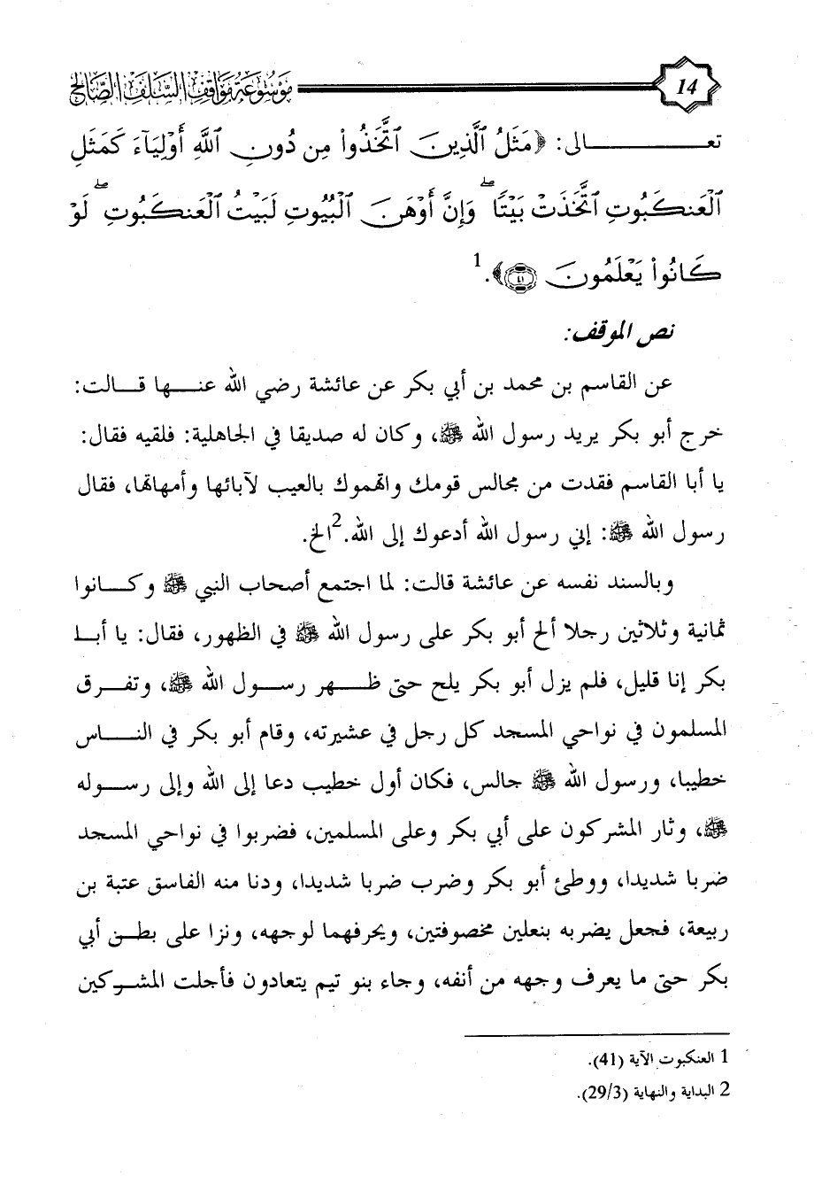 عن القاسم بن محمد بن أبي بكر عن عائشة رضي الله عنها قالت: خرج أبو بكر يريد رسول الله - صلى الله عليه وسلم -، وكان له صديقا في الجاهلية: فلقيه فقال: يا أبا القاسم فقدت من مجالس قومك واتهموك بالعيب لآبائها وأمهاتها، فقال رسول الله - صلى الله عليه وسلم -: إني رسول الله أدعوك إلى الله. (¬2) الخ.