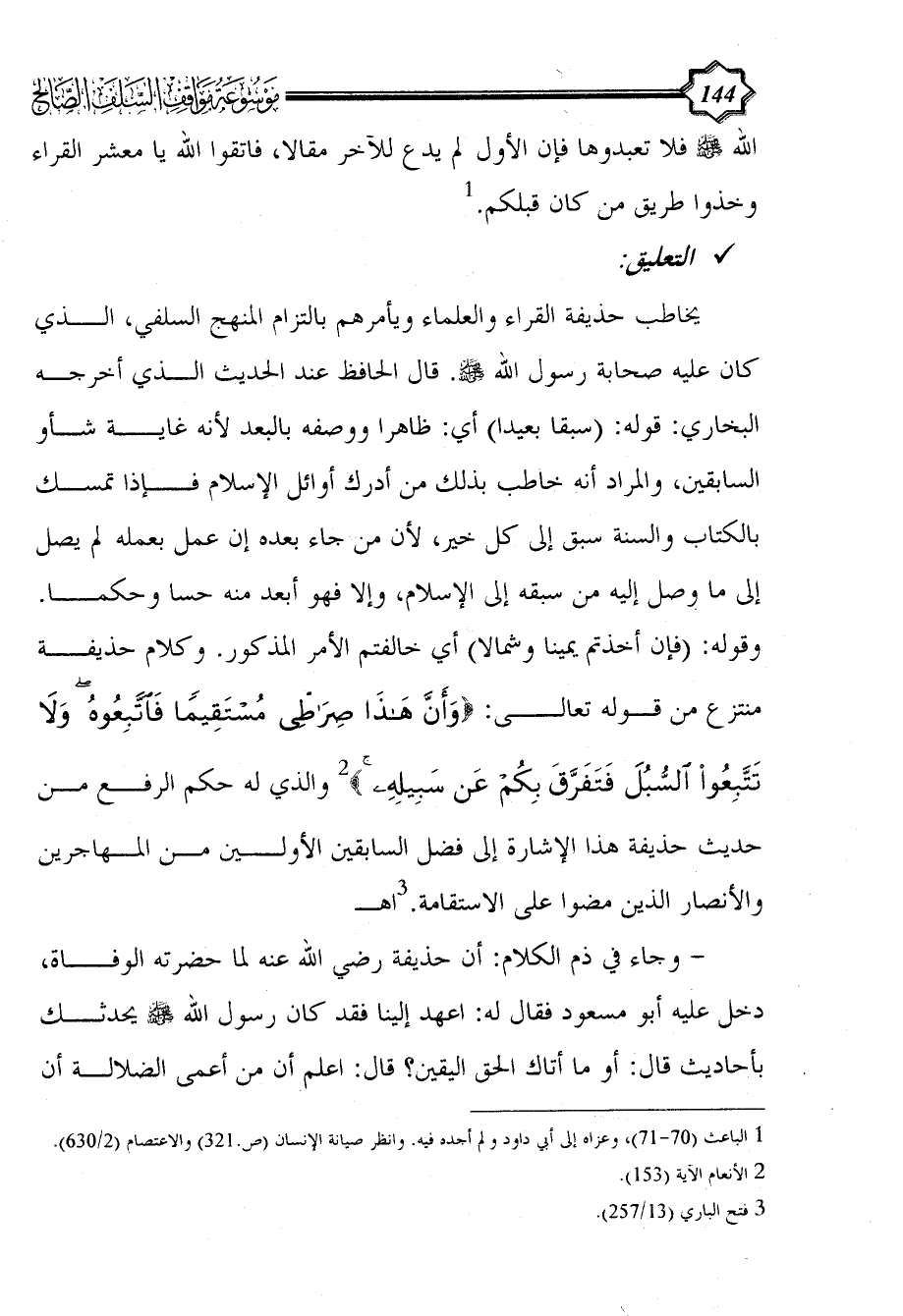 يخاطب حذيفة القراء والعلماء ويأمرهم بالتزام المنهج السلفي، الذي كان عليه صحابة رسول الله - صلى الله عليه وسلم -. قال الحافظ عند الحديث الذي أخرجه البخاري: قوله: (سبقا بعيدا) أي: ظاهرا ووصفه بالبعد لأنه غاية شأو السابقين، والمراد أنه خاطب بذلك من أدرك أوائل الإسلام فإذا تمسك بالكتاب والسنة سبق إلى كل خير، لأن من جاء بعده إن عمل بعمله لم يصل إلى ما وصل إليه من سبقه إلى الإسلام، وإلا فهو أبعد منه حسا وحكما. وقوله: (فإن أخذتم يمينا وشمالا) أي خالفتم الأمر المذكور. وكلام حذيفة منتزع من قوله تعالى: {وَأَنَّ هَذَا صِرَاطِي مُسْتَقِيمًا فَاتَّبِعُوهُ وَلَا تَتَّبِعُوا السُّبُلَ فَتَفَرَّقَ بِكُمْ عَنْ سَبِيلِهِ} (¬2) والذي له حكم الرفع من حديث حذيفة هذا الإشارة إلى فضل السابقين الأولين من المهاجرين والأنصار الذين مضوا على الاستقامة. (¬3) اهـ