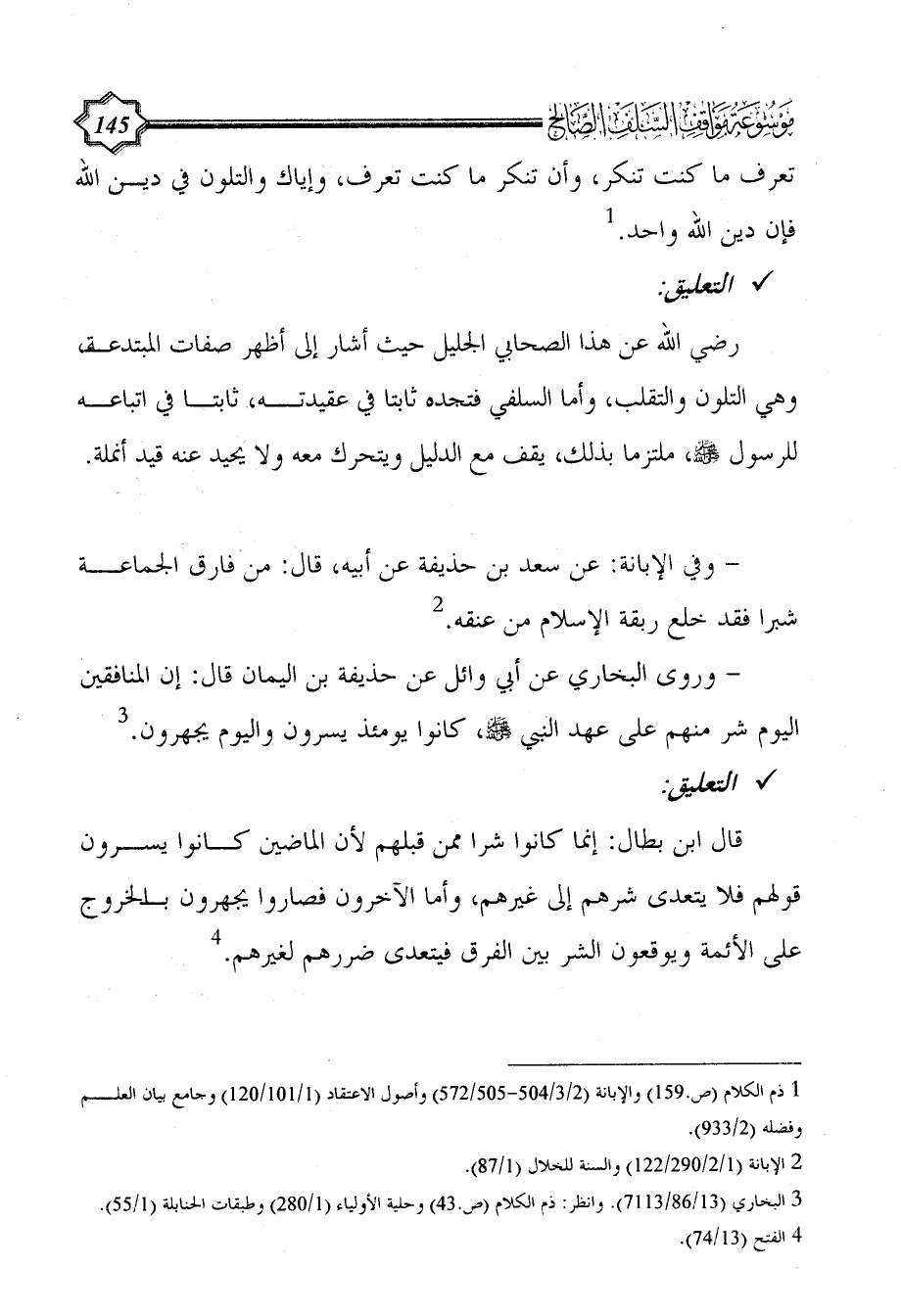 رضي الله عن هذا الصحابي الجليل حيث أشار إلى أظهر صفات المبتدعة، وهي التلون والتقلب، وأما السلفي فتجده ثابتا في عقيدته، ثابتا في اتباعه للرسول - صلى الله عليه وسلم -، ملتزما بذلك، يقف مع الدليل ويتحرك معه ولا يحيد عنه قيد أنملة.