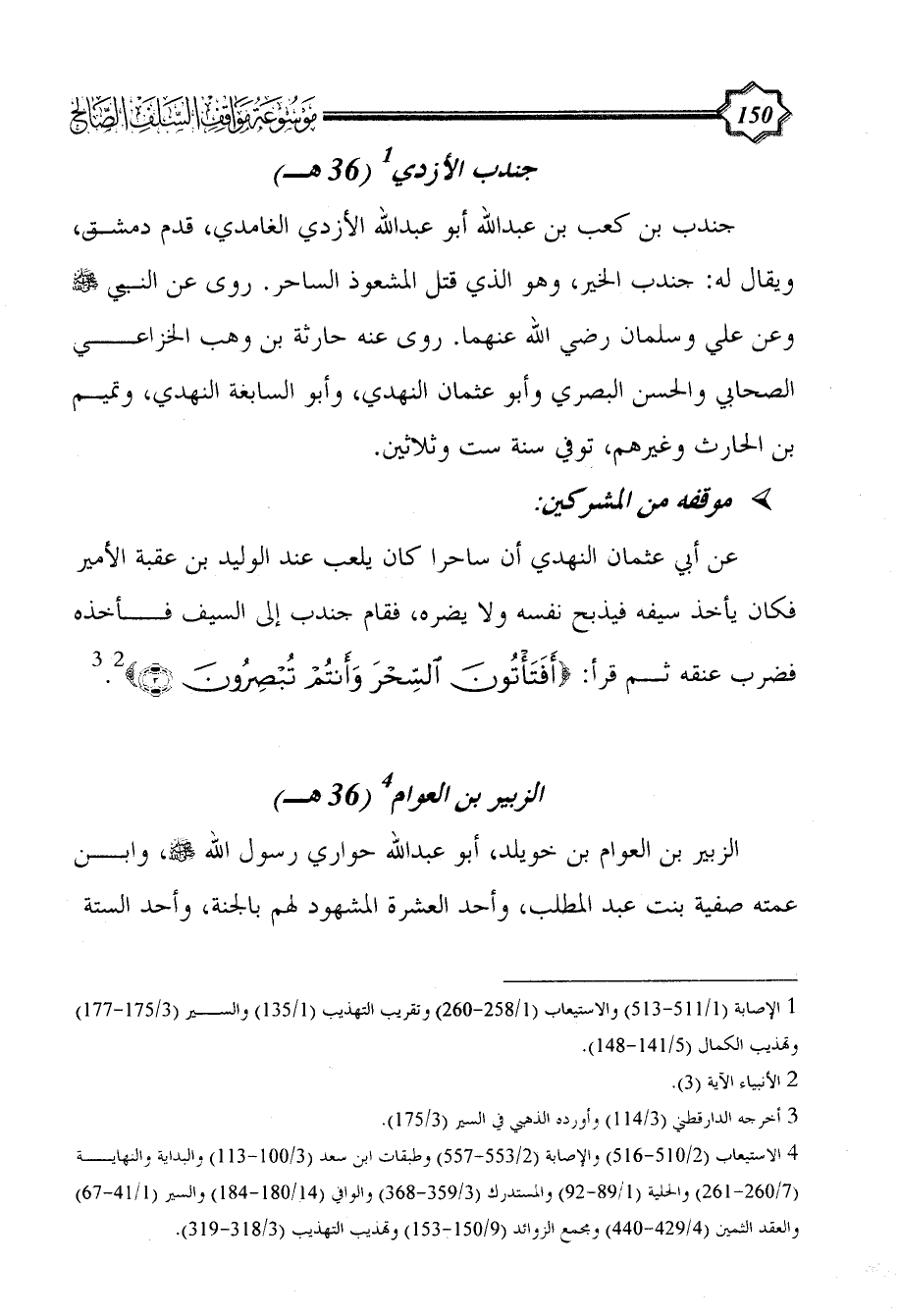 عن أبي عثمان النهدي أن ساحرا كان يلعب عند الوليد بن عقبة الأمير فكان يأخذ سيفه فيذبح نفسه ولا يضره، فقام جندب إلى السيف فأخذه فضرب عنقه ثم قرأ: {أَفَتَأْتُونَ السِّحْرَ وَأَنْتُمْ تُبْصِرُونَ} (¬2). (¬3)