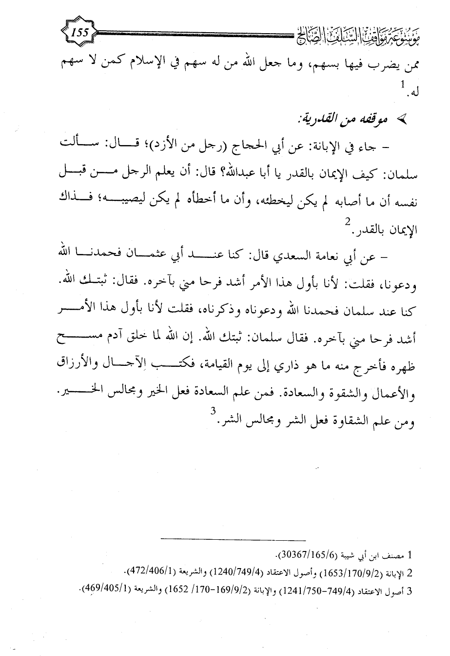 - جاء في الإبانة: عن أبي الحجاج (رجل من الأزد)؛ قال: سألت سلمان: كيف الإيمان بالقدر يا أبا عبد الله؟ قال: أن يعلم الرجل من قبل نفسه أن ما أصابه لم يكن ليخطئه، وأن ما أخطأه لم يكن ليصيبه؛ فذاك الإيمان بالقدر. (¬2)