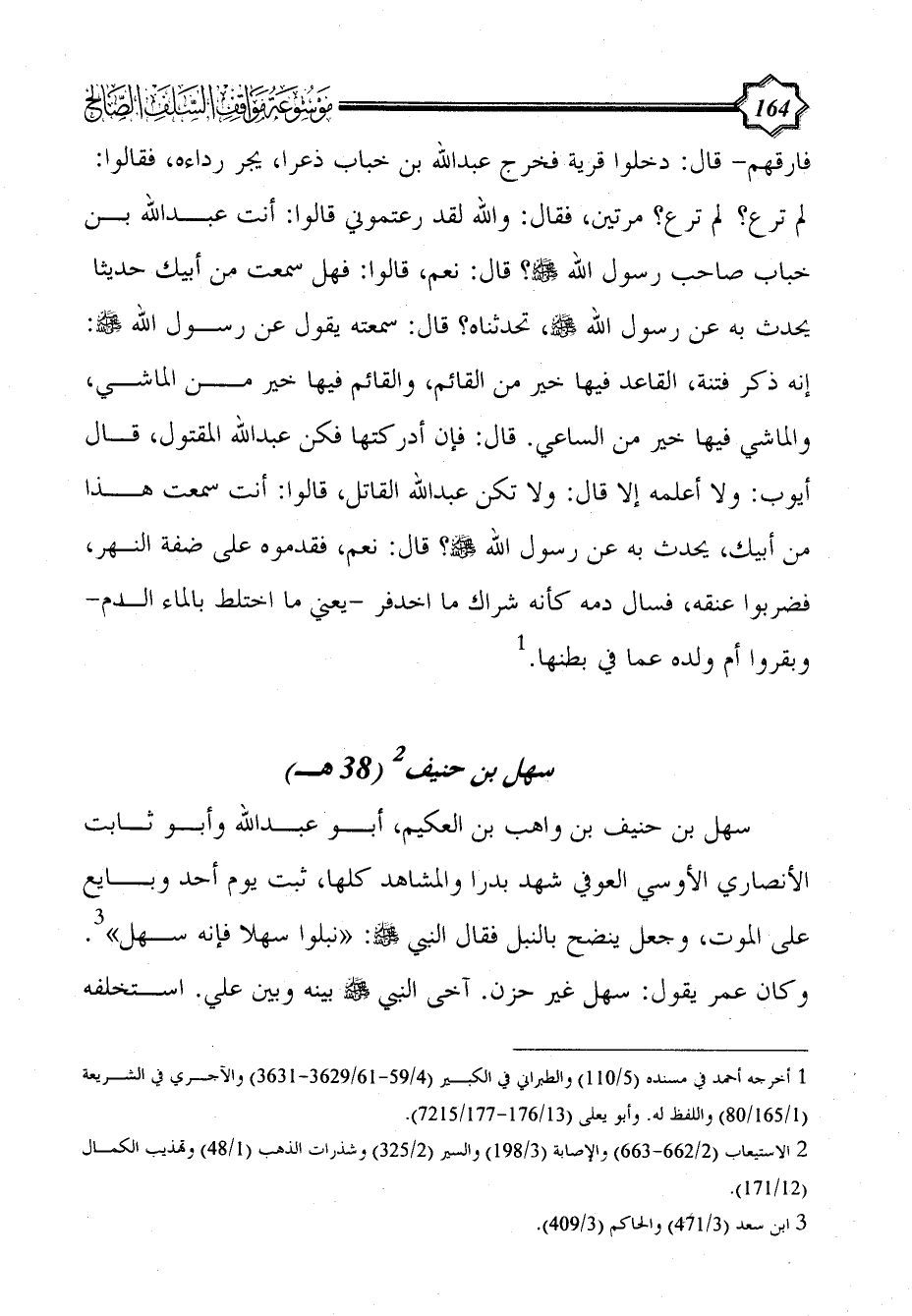 سهل بن حنيف بن واهب بن العكيم، أبو عبد الله وأبو ثابت الأنصاري الأوسي العوفي شهد بدرا والمشاهد كلها، ثبت يوم أحد وبايع على الموت، وجعل ينضح بالنبل فقال النبي - صلى الله عليه وسلم -: "نبلوا سهلا فإنه سهل" (¬3). وكان عمر يقول: سهل غير حزن. آخى النبي - صلى الله عليه وسلم - بينه وبين علي. استخلفه