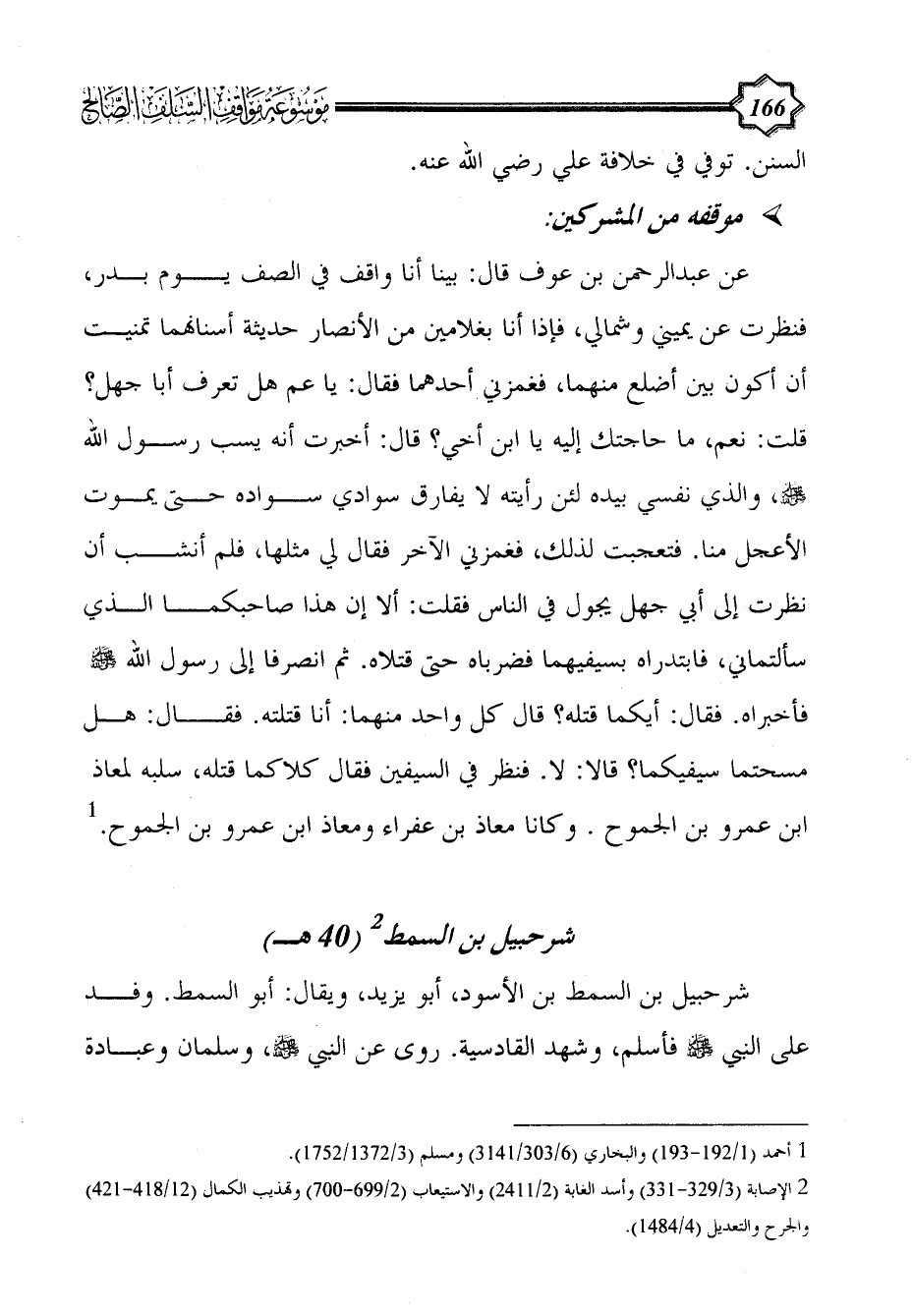 عن عبد الرحمن بن عوف قال: بينا أنا واقف في الصف يوم بدر، فنظرت عن يميني وشمالي، فإذا أنا بغلامين من الأنصار حديثة أسنانهما تمنيت أن أكون بين أضلع منهما، فغمزني أحدهما فقال: يا عم هل تعرف أبا جهل؟ قلت: نعم، ما حاجتك إليه يا ابن أخي؟ قال: أخبرت أنه يسب رسول الله - صلى الله عليه وسلم -، والذي نفسي بيده لئن رأيته لا يفارق سوادي سواده حتى يموت الأعجل منا. فتعجبت لذلك، فغمزني الآخر فقال لي مثلها، فلم أنشب أن نظرت إلى أبي جهل يجول في الناس فقلت: ألا إن هذا صاحبكما الذي سألتماني، فابتدراه بسيفيهما فضرباه حتى قتلاه. ثم انصرفا إلى رسول الله - صلى الله عليه وسلم - فأخبراه. فقال: أيكما قتله؟ قال كل واحد منهما: أنا قتلته. فقال: هل مسحتما سيفيكما؟ قالا: لا. فنظر في السيفين فقال كلاكما قتله، سلبه لمعاذ ابن عمرو بن الجموح. وكانا معاذ بن عفراء ومعاذ ابن عمرو بن الجموح. (¬1)