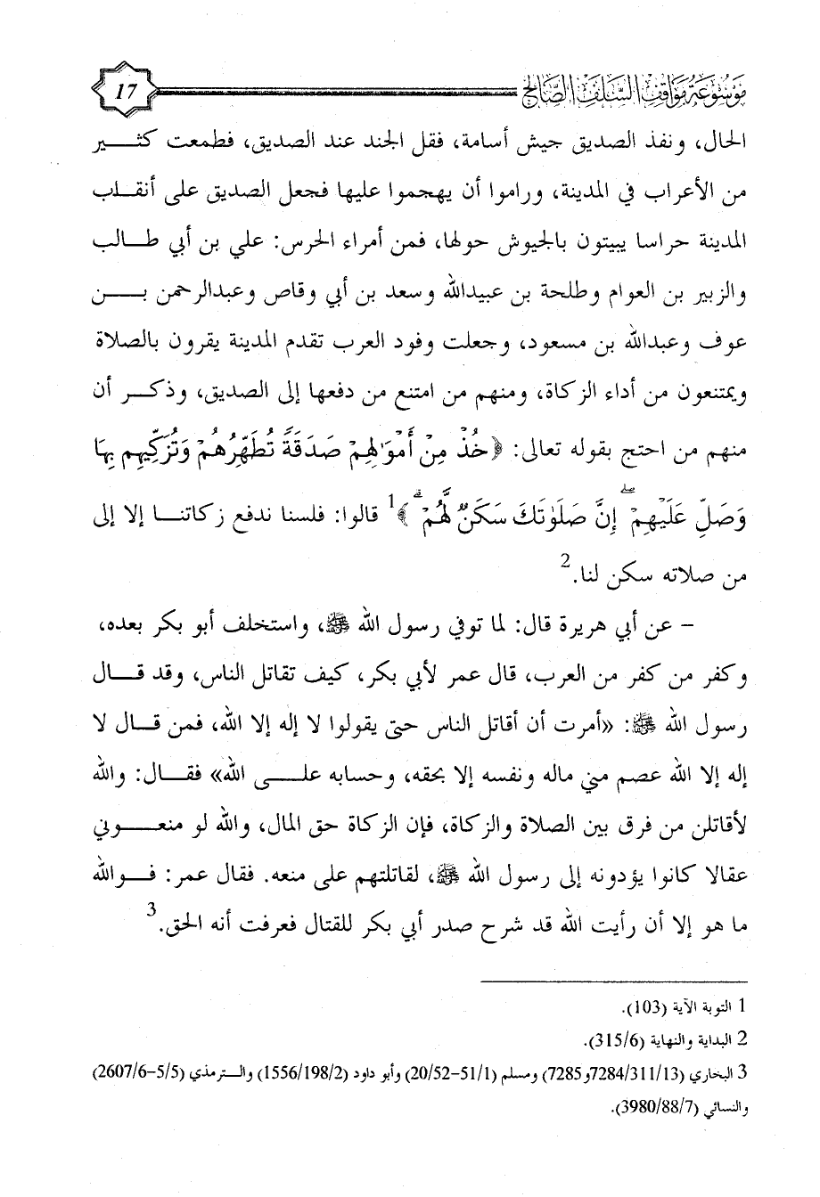 الحال، ونفذ الصديق جيش أسامة، فقل الجند عند الصديق، فطمعت كثير من الأعراب في المدينة، وراموا أن يهجموا عليها فجعل الصديق على أنقاب المدينة حراسا يبيتون بالجيوش حولها، فمن أمراء الحرس: علي بن أبي طالب والزبير بن العوام وطلحة بن عبيد الله وسعد بن أبي وقاص وعبد الرحمن بن عوف وعبد الله بن مسعود، وجعلت وفود العرب تقدم المدينة يقرون بالصلاة ويمتنعون من أداء الزكاة، ومنهم من امتنع من دفعها إلى الصديق، وذكر أن منهم من احتج بقوله تعالى: {خُذْ مِنْ أَمْوَالِهِمْ صَدَقَةً تُطَهِّرُهُمْ وَتُزَكِّيهِمْ بِهَا وَصَلِّ عَلَيْهِمْ إِنَّ صَلَاتَكَ سَكَنٌ لَهُمْ} (¬1) قالوا: فلسنا ندفع زكاتنا إلا إلى من صلاته سكن لنا. (¬2)