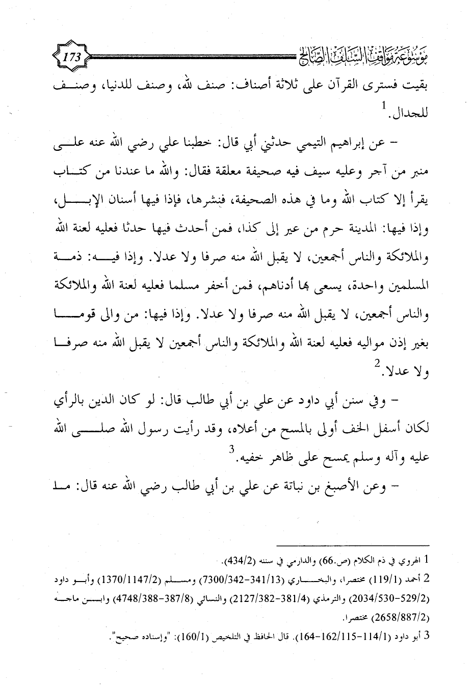 - عن إبراهيم التيمي حدثني أبي قال: خطبنا علي رضي الله عنه على منبر من آجر وعليه سيف فيه صحيفة معلقة فقال: والله ما عندنا من كتاب يقرأ إلا كتاب الله وما في هذه الصحيفة، فنشرها، فإذا فيها أسنان الإبل، وإذا فيها: المدينة حرم من عير إلى كذا، فمن أحدث فيها حدثا فعليه لعنة الله والملائكة والناس أجمعين، لا يقبل الله منه صرفا ولا عدلا. وإذا فيه: ذمة المسلمين واحدة، يسعى بها أدناهم، فمن أخفر مسلما فعليه لعنة الله والملائكة والناس أجمعين، لا يقبل الله منه صرفا ولا عدلا. وإذا فيها: من والى قوما بغير إذن مواليه فعليه لعنة الله والملائكة والناس أجمعين لا يقبل الله منه صرفا ولا عدلا. (¬2)