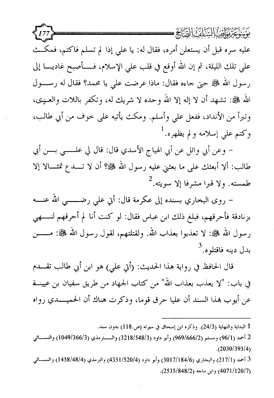 - روى البخاري بسنده إلى عكرمة قال: أتي علي رضي الله عنه بزنادقة فأحرقهم، فبلغ ذلك ابن عباس فقال: لو كنت أنا لم أحرقهم لنهي رسول الله - صلى الله عليه وسلم -: لا تعذبوا بعذاب الله. ولقتلتهم، لقول رسول الله - صلى الله عليه وسلم -: من بدل دينه فاقتلوه. (¬3)