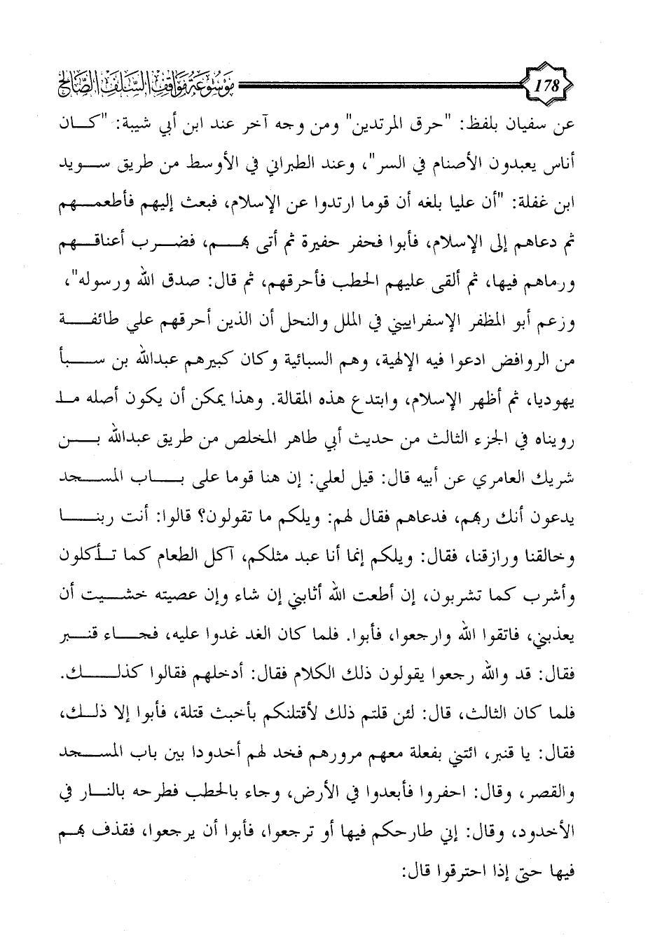 عن سفيان بلفظ: "حرق المرتدين" ومن وجه آخر عند ابن أبي شيبة: "كان أناس يعبدون الأصنام في السر"، وعند الطبراني في الأوسط من طريق سويد ابن غفلة: "أن عليا بلغه أن قوما ارتدوا عن الإسلام، فبعث إليهم فأطعمهم ثم دعاهم إلى الإسلام، فأبوا فحفر حفيرة ثم أتى بهم، فضرب أعناقهم ورماهم فيها، ثم ألقى عليهم الحطب فأحرقهم، ثم قال: صدق الله ورسوله"، وزعم أبو المظفر الإسفراييني في الملل والنحل أن الذين أحرقهم علي طائفة من الروافض ادعوا فيه الإلهية، وهم السبائية وكان كبيرهم عبد الله بن سبأ يهوديا، ثم أظهر الإسلام، وابتدع هذه المقالة. وهذا يمكن أن يكون أصله ما رويناه في الجزء الثالث من حديث أبي طاهر المخلص من طريق عبد الله بن شريك العامري عن أبيه قال: قيل لعلي: إن هنا قوما على باب المسجد يدعون أنك ربهم، فدعاهم فقال لهم: ويلكم ما تقولون؟ قالوا: أنت ربنا وخالقنا ورازقنا، فقال: ويلكم إنما أنا عبد مثلكم، آكل الطعام كما تأكلون وأشرب كما تشربون، إن أطعت الله أثابني إن شاء وإن عصيته خشيت أن يعذبني، فاتقوا الله وارجعوا، فأبوا. فلما كان الغد غدوا عليه، فجاء قنبر فقال: قد والله رجعوا يقولون ذلك الكلام فقال: أدخلهم فقالوا كذلك. فلما كان الثالث، قال: لئن قلتم ذلك لأقتلنكم بأخبث قتلة، فأبوا إلا ذلك، فقال: يا قنبر، ائتني بفعلة معهم مرورهم فخدَّ لهم أخدودا بين باب المسجد والقصر، وقال: احفروا فأبعدوا في الأرض، وجاء بالحطب فطرحه بالنار في الأخدود، وقال: إني طارحكم فيها أو ترجعوا، فأبوا أن يرجعوا، فقذف بهم فيها حتى إذا احترقوا قال: