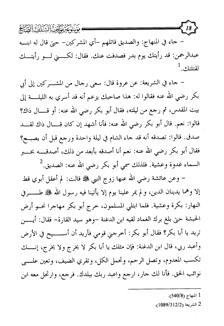 - جاء في المنهاج: والصديق قاتلهم -أي المشركين- حتى قال له ابنه عبد الرحمن: قد رأيتك يوم بدر فصدفت عنك. فقال: لكني لو رأيتك لقتلتك. (¬1)