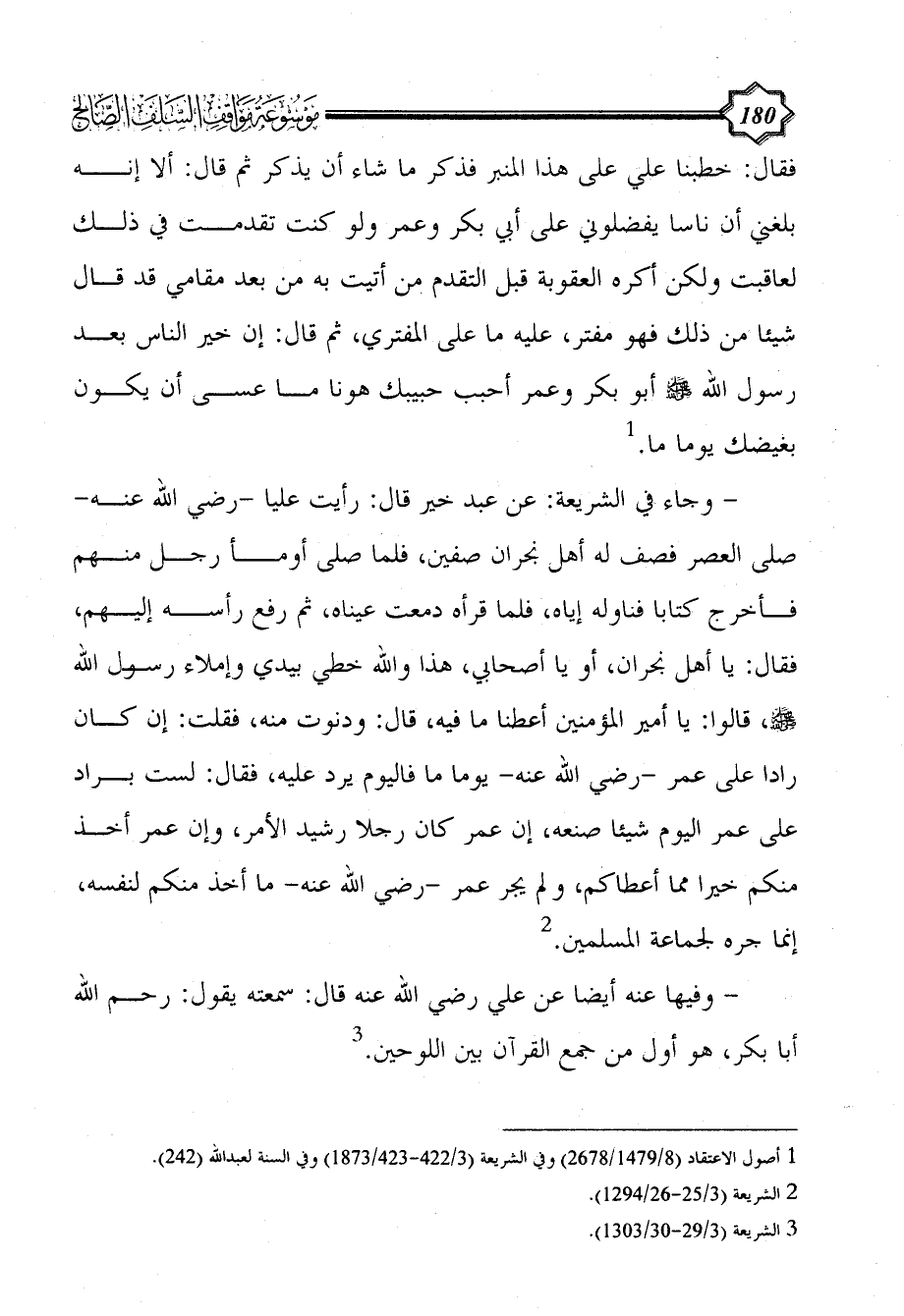 - وجاء في الشريعة: عن عبد خير قال: رأيت عليا -رضي الله عنه- صلى العصر فصف له أهل نجران صفين، فلما صلى أومأ رجل منهم فأخرج كتابا فناوله إياه، فلما قرأه دمعت عيناه، ثم رفع رأسه إليهم، فقال: يا أهل نجران، أو يا أصحابي، هذا والله خطي بيدي وإملاء رسول الله - صلى الله عليه وسلم -، قالوا: يا أمير المؤمنين أعطنا ما فيه، قال: ودنوت منه، فقلت: إن كان رادا على عمر -رضي الله عنه- يوما ما فاليوم يرد عليه، فقال: لست براد على عمر اليوم شيئا صنعه، إن عمر كان رجلا رشيد الأمر، وإن عمر أخذ منكم خيرا مما أعطاكم، ولم يجر عمر -رضي الله عنه- ما أخذ منكم لنفسه، إنما جره لجماعة المسلمين. (¬2)