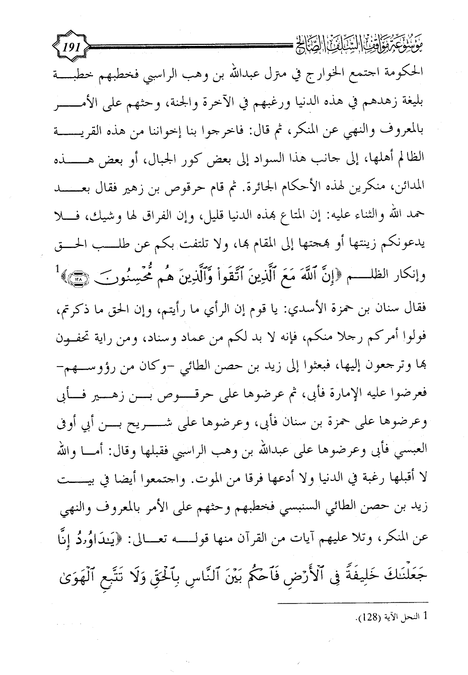 الحكومة اجتمع الخوارج في منزل عبد الله بن وهب الراسبي فخطبهم خطبة بليغة زهدهم في هذه الدنيا ورغبهم في الآخرة والجنة، وحثهم على الأمر بالمعروف والنهي عن المنكر، ثم قال: فاخرجوا بنا إخواننا من هذه القرية الظالم أهلها، إلى جانب هذا السواد إلى بعض كور الجبال، أو بعض هذه المدائن، منكرين لهذه الأحكام الجائرة. ثم قام حرقوص بن زهير فقال بعد حمد الله والثناء عليه: إن المتاع بهذه الدنيا قليل، وإن الفراق لها وشيك، فلا يدعونكم زينتها أو بهجتها إلى المقام بها، ولا تلتفت بكم عن طلب الحق وإنكار الظلم {إِنَّ اللَّهَ مَعَ الَّذِينَ اتَّقَوْا وَالَّذِينَ هُمْ محسنون} (¬1) فقال سنان بن حمزة الأسدي: يا قوم إن الرأي ما رأيتم، وإن الحق ما ذكرتم، فولوا أمركم رجلا منكم، فإنه لا بد لكم من عماد وسناد، ومن راية تحفون بها وترجعون إليها، فبعثوا إلى زيد بن حصن الطائي -وكان من رؤوسهم- فعرضوا عليه الإمارة فأبى، ثم عرضوها على حرقوص بن زهير فأبى وعرضوها على حمزة بن سنان فأبى، وعرضوها على شريح بن أبي أوفى العبسي فأبى وعرضوها على عبد الله بن وهب الراسبي فقبلها وقال: أما والله لا أقبلها رغبة في الدنيا ولا أدعها فرقا من الموت. واجتمعوا أيضا في بيت زيد بن حصن الطائي السنبسي فخطبهم وحثهم على الأمر بالمعروف والنهي عن المنكر، وتلا عليهم آيات من القرآن منها قوله تعالى: {يَا دَاوُودُ إِنَّا جَعَلْنَاكَ خَلِيفَةً فِي الْأَرْضِ فَاحْكُمْ بَيْنَ النَّاسِ بِالْحَقِّ وَلَا تَتَّبِعِ الْهَوَى