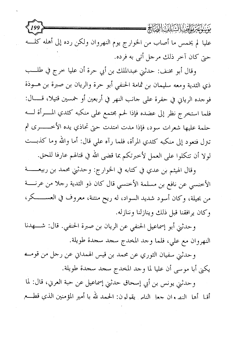 وحدثني أبو إسماعيل الحنفي عن الريان بن صبرة الحنفي. قال: شهدنا النهروان مع علي، فلما وجد المخدج سجد سجدة طويلة.