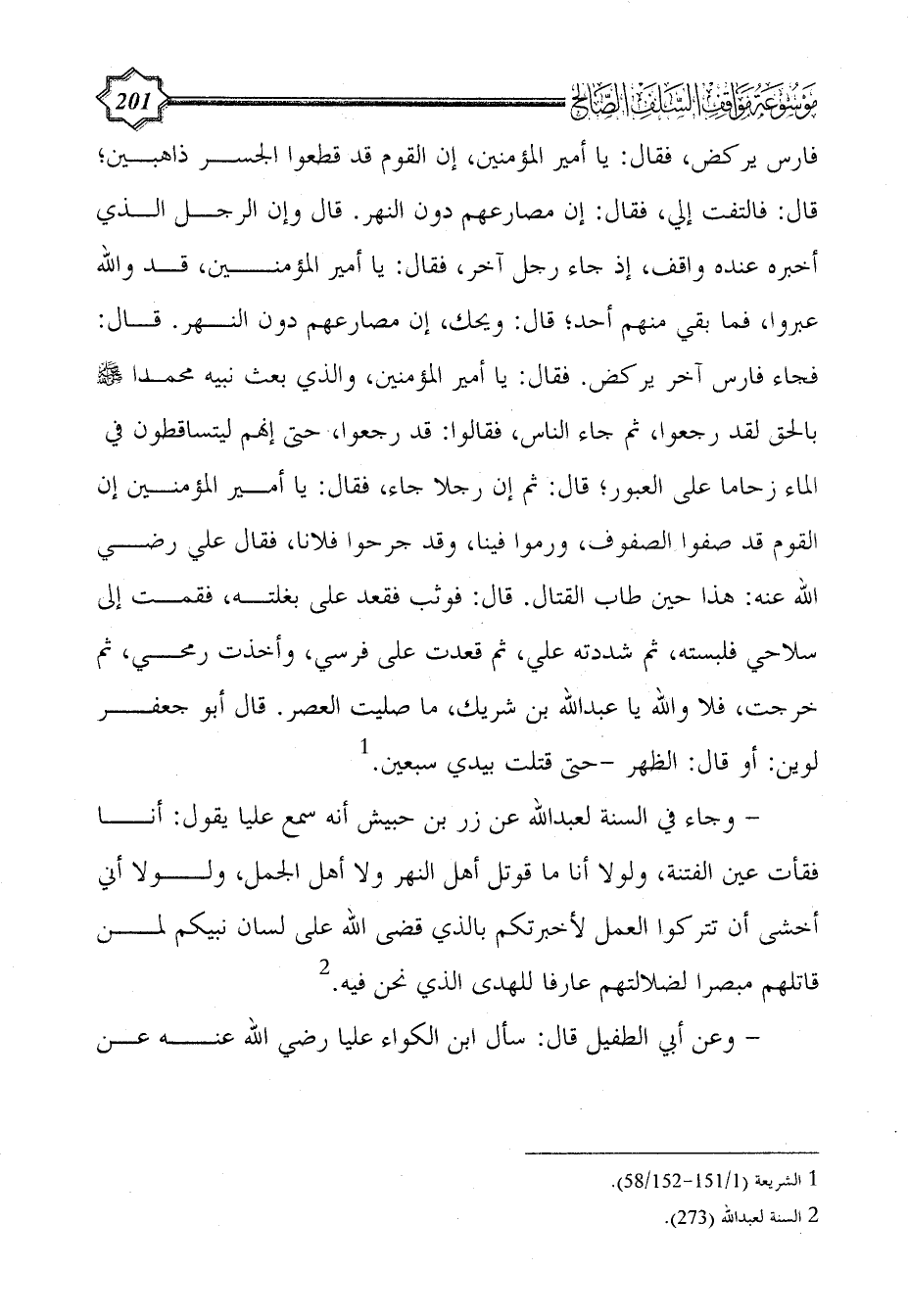 - وجاء في السنة لعبد الله عن زر بن حبيش أنه سمع عليا يقول: أنا فقأت عين الفتنة، ولولا أنا ما قوتل أهل النهر ولا أهل الجمل، ولولا أني أخشى أن تتركوا العمل لأخبرتكم بالذي قضى الله على لسان نبيكم لمن قاتلهم مبصرا لضلالتهم عارفا للهدى الذي نحن فيه. (¬2)