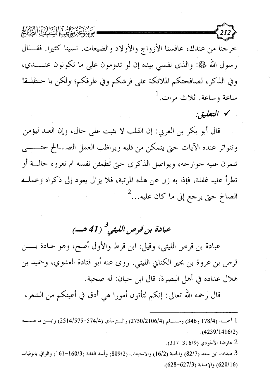 خرجنا من عندك، عافسنا الأزواج والأولاد والضيعات. نسينا كثيرا. فقال رسول الله - صلى الله عليه وسلم -: والذي نفسي بيده إن لو تدومون على ما تكونون عندي، وفي الذكر، لصافحتكم الملائكة على فرشكم وفي طرقكم؛ ولكن يا حنظلة! ساعة وساعة. ثلاث مرات. (¬1)