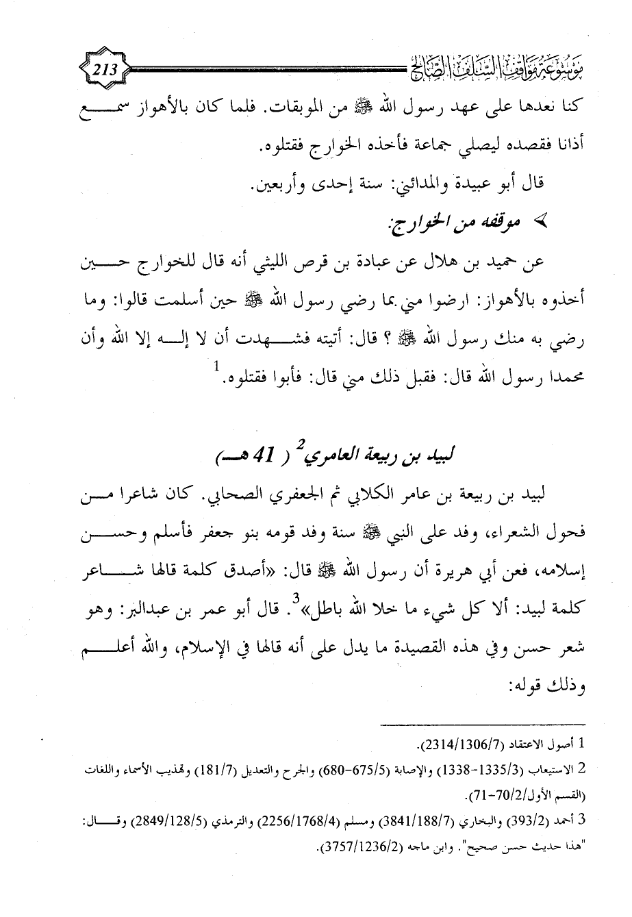 لبيد بن ربيعة بن عامر الكلابي ثم الجعفري الصحابي. كان شاعرا من فحول الشعراء، وفد على النبي - صلى الله عليه وسلم - سنة وفد قومه بنو جعفر فأسلم وحسن إسلامه، فعن أبي هريرة أن رسول الله - صلى الله عليه وسلم - قال: "أصدق كلمة قالها شاعر كلمة لبيد: ألا كل شيء ما خلا الله باطل" (¬3). قال أبو عمر بن عبد البر: وهو شعر حسن وفي هذه القصيدة ما يدل على أنه قالها في الإسلام، والله أعلم وذلك قوله: