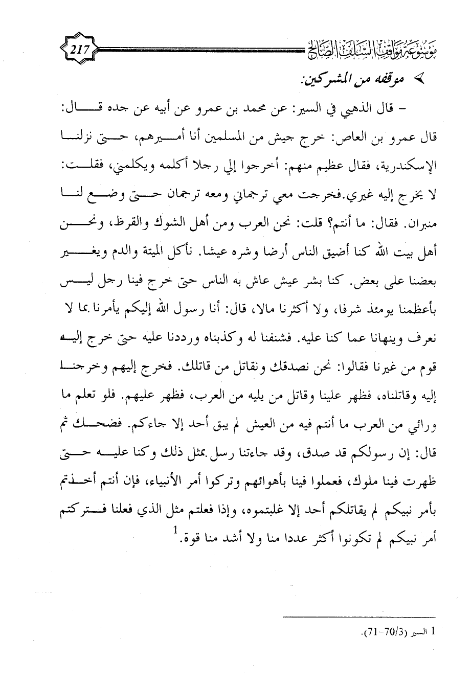 - قال الذهبي في السير: عن محمد بن عمرو عن أبيه عن جده قال: قال عمرو بن العاص: خرج جيش من المسلمين أنا أميرهم، حتى نزلنا الإسكندرية، فقال عظيم منهم: أخرجوا إلي رجلا أكلمه ويكلمني، فقلت: لا يخرج إليه غيري. فخرجت معي ترجماني ومعه ترجمان حتى وضع لنا منبران. فقال: ما أنتم؟ قلت: نحن العرب ومن أهل الشوك والقرظ، ونحن أهل بيت الله كنا أضيق الناس أرضا وشره عيشا. نأكل الميتة والدم ويغير بعضنا على بعض. كنا بشر عيش عاش به الناس حتى خرج فينا رجل ليس بأعظمنا يومئذ شرفا، ولا أكثرنا مالا، قال: أنا رسول الله إليكم يأمرنا بما لا نعرف وينهانا عما كنا عليه. فشنفنا له وكذبناه ورددنا عليه حتى خرج إليه قوم من غيرنا فقالوا: نحن نصدقك ونقاتل من قاتلك. فخرج إليهم وخرجنا إليه وقاتلناه، فظهر علينا وقاتل من يليه من العرب، فظهر عليهم. فلو تعلم ما ورائي من العرب ما أنتم فيه من العيش لم يبق أحد إلا جاءكم. فضحك ثم قال: إن رسولكم قد صدق، وقد جاءتنا رسل بمثل ذلك وكنا عليه حتى ظهرت فينا ملوك، فعملوا فينا بأهوائهم وتركوا أمر الأنبياء، فإن أنتم أخذتم بأمر نبيكم لم يقاتلكم أحد إلا غلبتموه، وإذا فعلتم مثل الذي فعلنا فتركتم أمر نبيكم لم تكونوا أكثر عددا منا ولا أشد منا قوة. (¬1)
